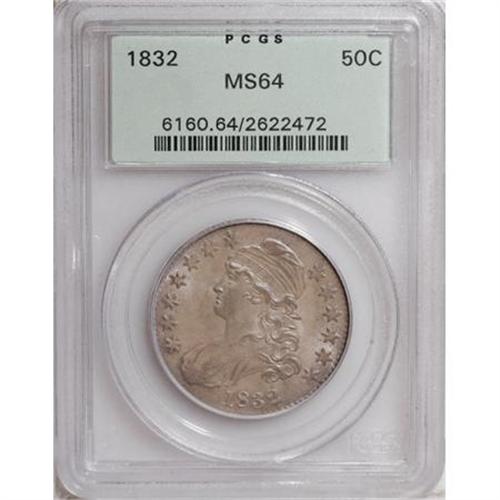 <B>1832 50C Small Letters MS64 PCGS.</B></I> O-110, R.1. A small spike at the peak of Liberty's cap, and recutting on the 5 in 50 C. confirm this variety. Softness on the A in STATES and URI in PLURIBUS are likewise diagnostic. This example also shows prominent doubling on Liberty's eye and portrait, from the forelock to the chin. This well struck near-Gem displays lovely dove-gray patina over remarkably clean surfaces. Housed in an early-generation PCGS holder with a green label. <BR><I>From the Jerry and Shelly Ferrero Collection.</B></I><BR><BR><B>Coin Engraver:</B> John Reich<BR><BR><b>Shipping:</b> Coins & Currency (<a target="_blank" href="http://www.heritageauctions.com/common/shipping.php">view shipping information</a>)