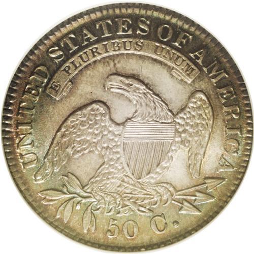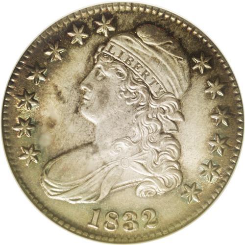 <B>1832<50C> Small Letters MS65 NGC.</B></I> O-103, R.1. A die lump on the drapery fold and a recut 5 in the denomination confirm the Overton marriage. Blue-green and chestnut-gold toning endow this well struck Gem. Luster is ample, and the reverse is undisturbed. Light marks beneath the ear and near the chin are of little import.