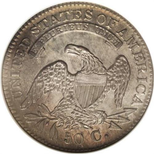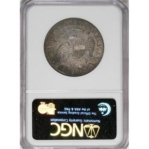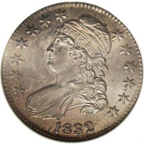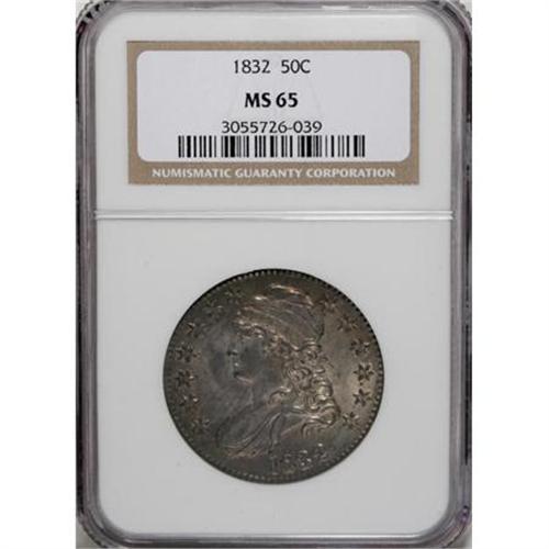 <B>1832 50C Small Letters MS65 NGC.</B></I> O-103, R.1. The recut stand on the 5 in the denomination narrows the attribution. This evenly struck and nearly mark-free example is attractively toned in steel-gray, peach-gold, and forest-green shades. Desirable in such exemplary quality. Census: 28 in 65, 11 finer (8/07).<BR><BR><B>Coin Engraver:</B> John Reich<BR><BR><b>Shipping:</b> Coins & Currency (<a target="_blank" href="http://www.heritageauctions.com/common/shipping.php">view shipping information</a>)
