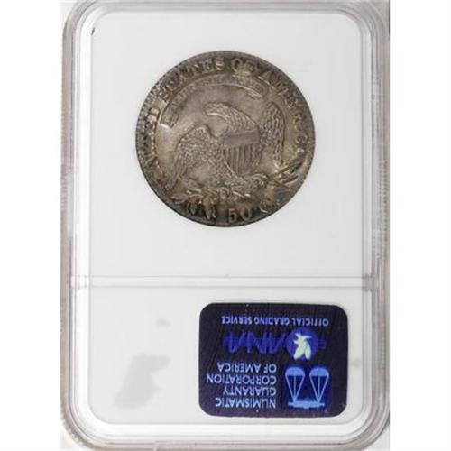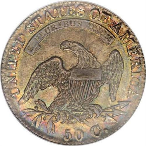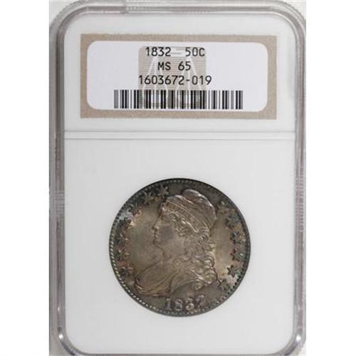 <B>1832 50C Small Letters MS65 NGC.</B></I> O-119, Low R.4. This Gem Mint State piece is undoubtedly in the Condition Census of the variety, and may be one of the two finest known examples. The fourth edition of Overton, by Donald Parsley, records the finest known to him as MS67, and the second finest just MS60. Stephen J. Herrman does not indicate any recent auction appearances above MS63. <BR> We are certain that this Gem has been off the market for many years, and is probably not known to the current generation of collectors. It is a lovely olive-gold example with pale rose and light blue peripheral iridescence.<BR><BR><B>Coin Engraver:</B> John Reich<BR><BR><b>Shipping:</b> Coins & Currency (<a target="_blank" href="http://www.heritageauctions.com/common/shipping.php">view shipping information</a>)