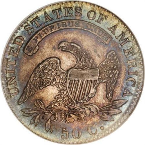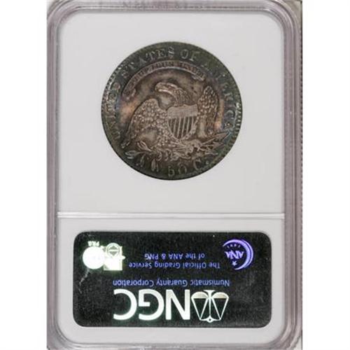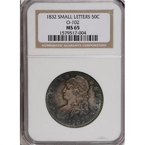 <B>1832 50C Small Letters MS65 NGC.</B></I> O-102, R.1. A tine from the eagle's right wingtip and a die line through Liberty's lips confirm the Overton variety. Iridescent electric-blue peripheral toning frames golden-tan and gray central area patina. A well executed strike sharpens most of the design elements on this well preserved Gem. Census: 31 in 65, 11 finer (12/07).<BR><BR><B>Coin Engraver:</B> John Reich<BR><BR><b>Shipping:</b> Coins & Currency (<a target="_blank" href="http://www.heritageauctions.com/common/shipping.php">view shipping information</a>)