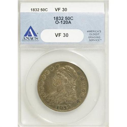 <B>1832 50C Small Letters VF30 ANACS.</B></I> O-120A. NGC Census: (20/1310). PCGS Population (21/1147). Mintage: 4,797,000. Numismedia Wsl. Price for NGC/PCGS coin in VF30: $60. (#6160)<BR><BR><B>Coin Engraver:</B> John Reich<BR><BR><b>Shipping:</b> Coins & Currency (<a target="_blank" href="http://www.heritageauctions.com/common/shipping.php">view shipping information</a>)