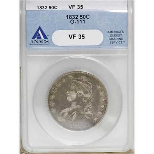 <B>1832 50C Small Letters VF35 ANACS.</B></I> O-111. NGC Census: (15/1297). PCGS Population (37/1111). Mintage: 4,797,000. Numismedia Wsl. Price for NGC/PCGS coin in VF35: $66. (#6160)<BR><BR><B>Coin Engraver:</B> John Reich<BR><BR><b>Shipping:</b> Coins & Currency (<a target="_blank" href="http://www.heritageauctions.com/common/shipping.php">view shipping information</a>)