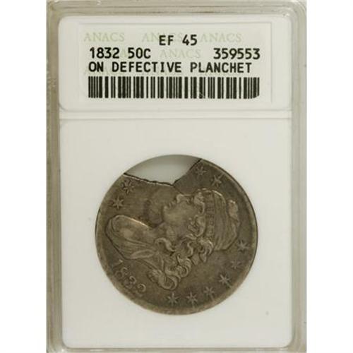 <B>1832 50C Half Dollar, Small Letters--Struck on A Defective Planchet--XF45 ANACS.</B></I> <BR><BR><B>Coin Engraver:</B> John Reich<BR><BR><b>Shipping:</b> Coins & Currency (<a target="_blank" href="http://www.heritageauctions.com/common/shipping.php">view shipping information</a>)