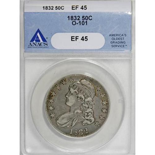 <B>1832 50C Small Letters XF45 ANACS.</B></I> O-101. NGC Census: (97/1166). PCGS Population (115/935). Mintage: 4,797,000. Numismedia Wsl. Price for NGC/PCGS coin in XF45: $195. (#6160)<BR><BR><B>Coin Engraver:</B> John Reich<BR><BR><b>Shipping:</b> Coins & Currency (<a target="_blank" href="http://www.heritageauctions.com/common/shipping.php">view shipping information</a>)