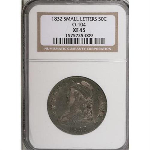 <B>1832 50C Small Letters XF45 NGC.</B></I> O-104. NGC Census: (99/1170). PCGS Population (121/958). Mintage: 4,797,000. Numismedia Wsl. Price for NGC/PCGS coin in XF45: $193. (#6160)<BR><BR><B>Coin Engraver:</B> John Reich<BR><BR><b>Shipping:</b> Coins & Currency (<a target="_blank" href="http://www.heritageauctions.com/common/shipping.php">view shipping information</a>)