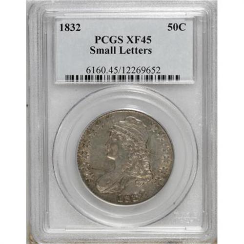 <B>1832 50C Small Letters XF45 PCGS.</B></I> . PCGS Population (118/950). NGC Census: (98/1171). Mintage: 4,797,000. Numismedia Wsl. Price for NGC/PCGS coin in XF45: $193. (#6160)<BR><BR><B>Coin Engraver:</B> John Reich<BR><BR><b>Shipping:</b> Coins & Currency (<a target="_blank" href="http://www.heritageauctions.com/common/shipping.php">view shipping information</a>)