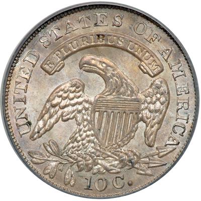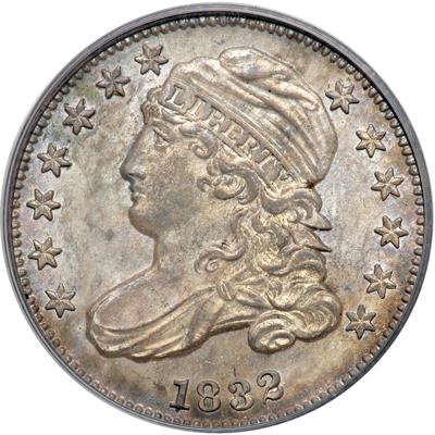 1832 Capped Bust Dime. . JR-4, Rarity-3. PCGS graded MS-65. Nice gold and lavender toning. Well struck. Three obverse and five reverse dies were combined to create to produce seven varieties. The recorded mintage for this year was 522,500 coins. This was the final full year of coinage at the first Mint facility. The new Mint building of the Second Philadelphia Mint had been under construction since the summer of 1829 and was finally nearing completion.