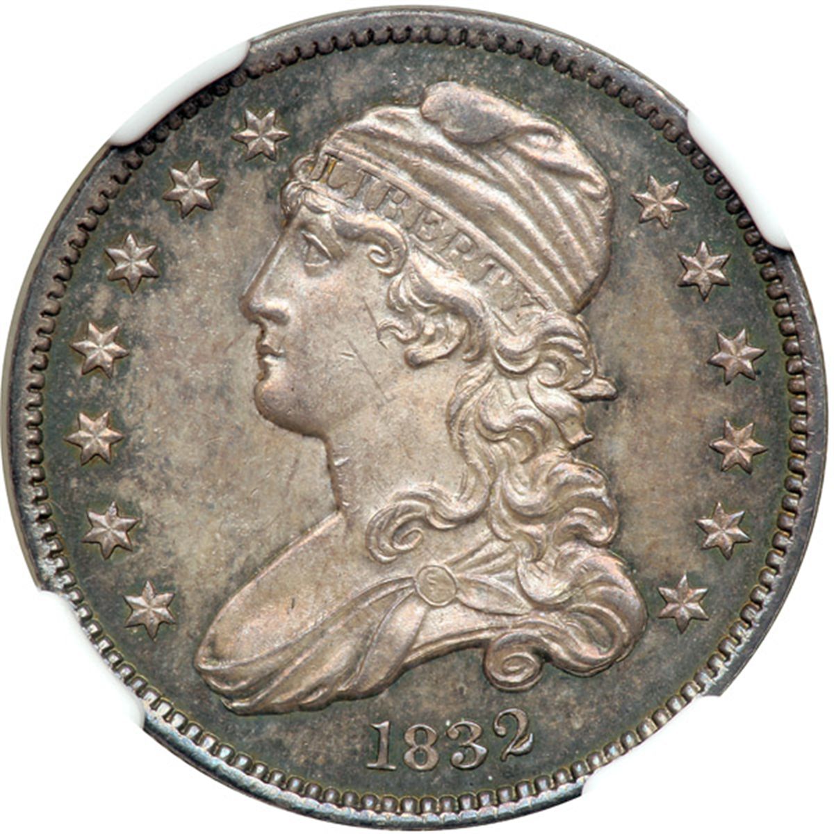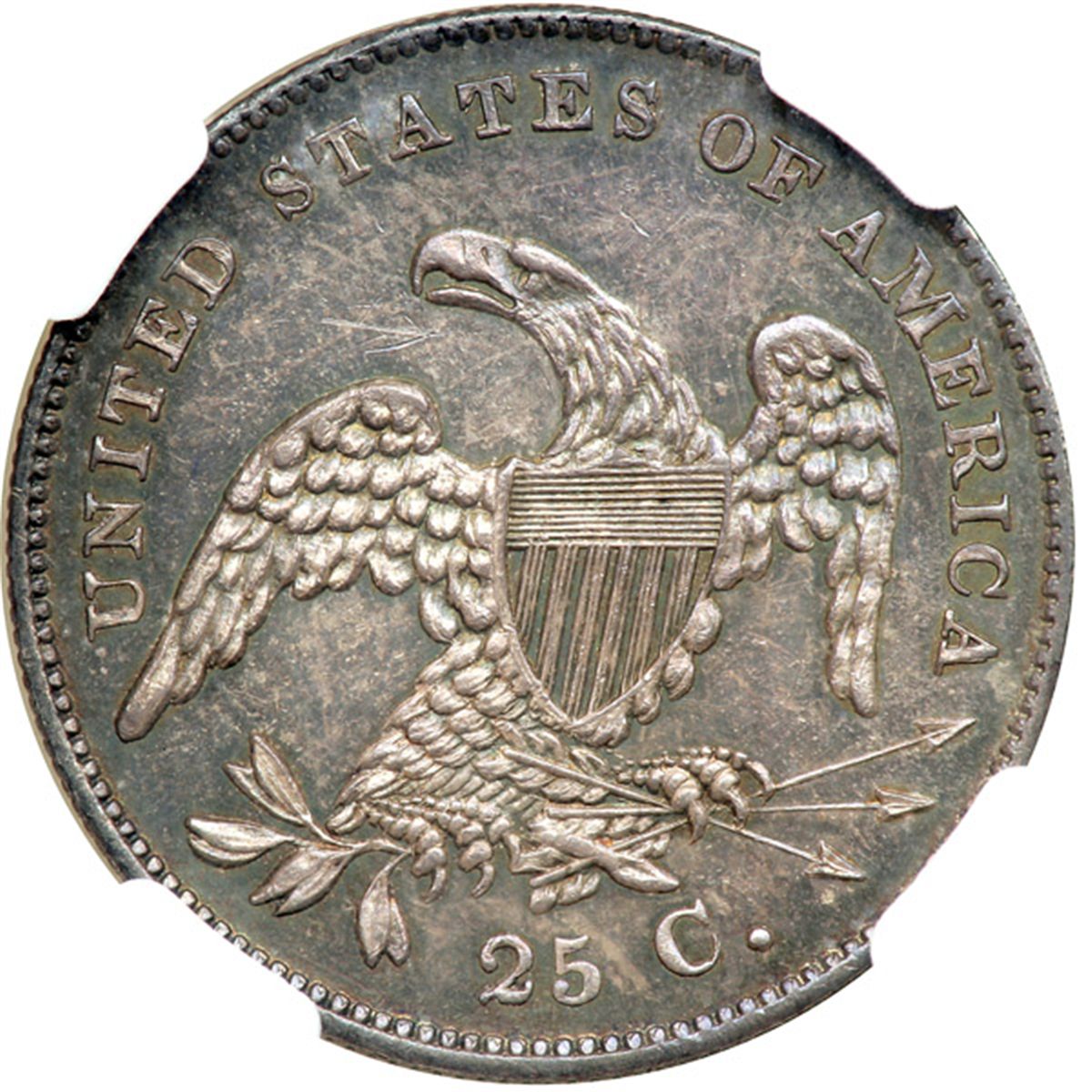1832 Capped Bust Quarter Dollar. . Browning-2. NGC graded MS-64+ CAC Approved. Well struck with lovely lilac, golden and royal blue iridescent toning. A lovely Premium Quality example with only a few light marks below the beak to preclude a higher numerical grade. Both sides exhibit natural toning with an above-average, well-centered strike and underlying frosted luster. Pop 1; 2 finer, 1 in 65, 1 in 66.