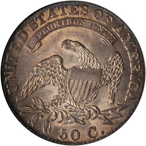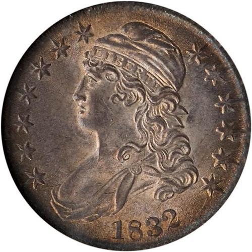 <b>1832 Capped Bust Half Dollar. NGC graded MS65.</b> Sport-free and clean as a whistle, as one would expect from the grade; however, what really sets this coin apart from others is its pleasing cartwheel luster that rolls around each side. The color and surface clarity is similar to the 1831 MS65 just offered, with almost identical (and beautiful) dusky gray and antique gold accents. Struck with controlled precision throughout the outer peripheral areas, although somewhat weak and compromised at the following locations, possibly due to overworking the dies: the stars (which are "pulled" toward the rims), and portions of the shield on the eagle's breast <b>(PCGS # 6160)</b>