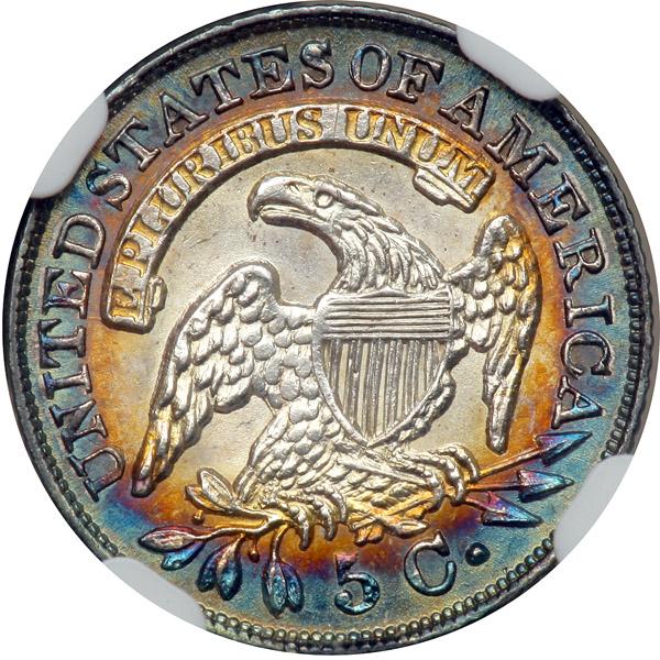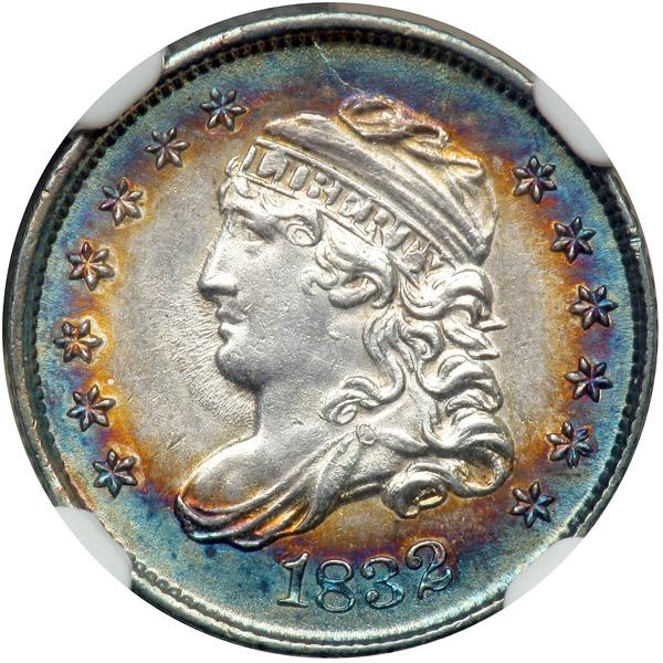 1832. NGC graded MS-66. Star. A little jewel of a specimen with stunning russet and electric blue toning about the borders on both sides. This vibrant and highly lustrous Gem offers a rush of luster that shows this has exquisitely preserved surfaces under the toning. Struck with methodical precision throughout. Pop 58; 13 finer.
