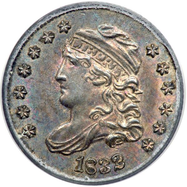 1832 Capped Bust Half Dime. PCGS graded MS-63. Well struck and choice, toned on both sides this little beauty featuring darker shades of lilac and blue. Capped Bust half dimes were issued in 1829-37, a short run compared to the more venerable Capped Bust half dollars of 1807-36 (PCGS # 4279) .