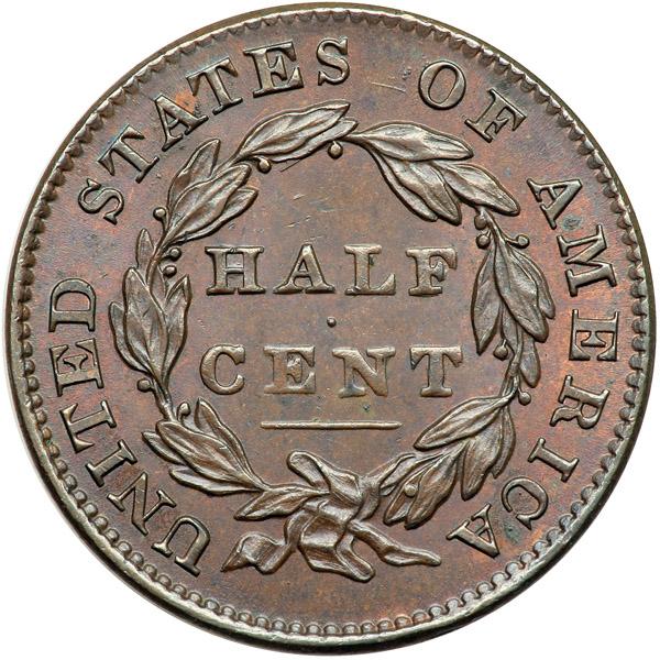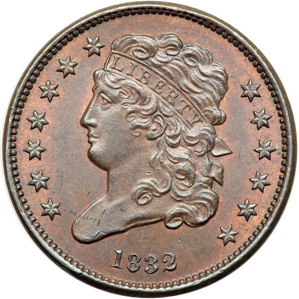 1832 C-1 R2 MS62. Lustrous medium chocolate with bluish steel brown overtones. At least 10% of the planchet shows mellowed mint red, mostly on the obverse. The fields are satiny and offer excellent eye appeal. Would rate a higher grade but there are several tiny ticks on the bust tip. MDS with a fine die crack from the dentils down through the A in STATES extending weakly to the tip of the leaf below. Removed from a PCGS slab graded MS64RB (old green PCGS label included, #1160.64/5224214).