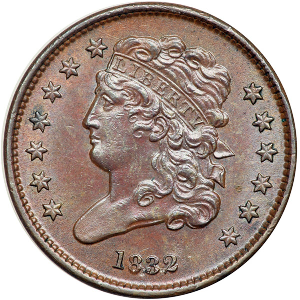 1832 C-2 R2 AU58. Frosty medium brown and light chocolate. Satiny mint luster covers the protected areas. There are a few tiny spots of darker toning, including one on star 4 and another that contains traces of carbon on the leaf tip under D in UNITED. Just a hint of rub on the highest points from mint state. LDS, Manley state 3.0. The die crack at TE in STATES is clear and reaches the wreath.