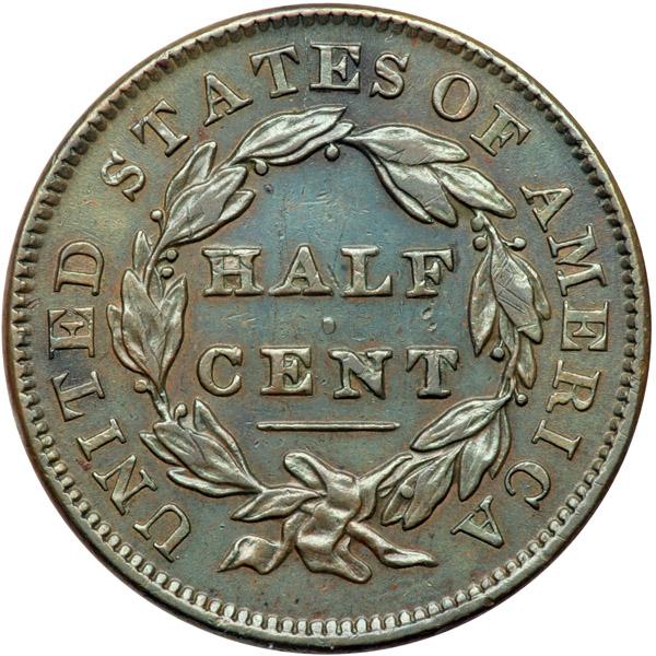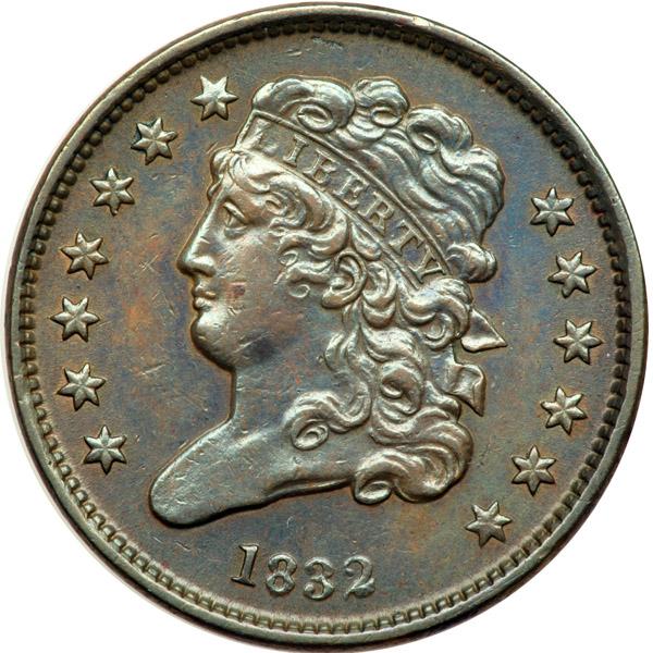 1832 C-2 R2 VF35. At least five points sharper but lightly cleaned and retoned light greenish olive with subtle overtones of bluish steel. Smooth and attractive with only a few trivial marks. The notable ones are a small spot of reddish chocolate toning right of the upper lip and a pair of tiny pinpricks under the F in HALF. M-LDS, Manley state 3.0, with a fine die crack from the hair over the L in LIBERTY to the dentils above star 7. The earlier crack down through TE in STATES is clear. Davy #32.2.7.