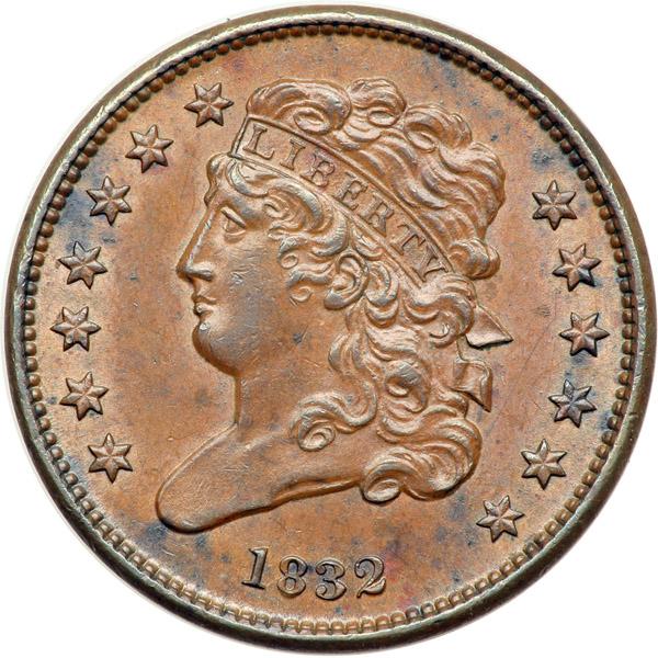 1832 C-3 R2 AU55. Frosty medium chocolate brown with slightly lighter steel brown in protected areas and a few small wisps of darker olive and steel toning on both sides. The protected areas are covered with satiny mint luster. No notable defects, just a light touch of friction on the highest points. MDS with fine radial die flowlines on both sides and the usual tiny lumps from die rust covering parts of the reverse. The repunching on the second S in STATES and AM in AMERICA remains clear. Noyes photo #74353.