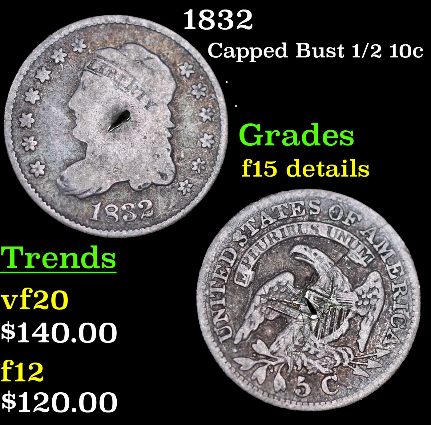 1832 Capped Bust Half Dime 1/2 10c Grades F Details.