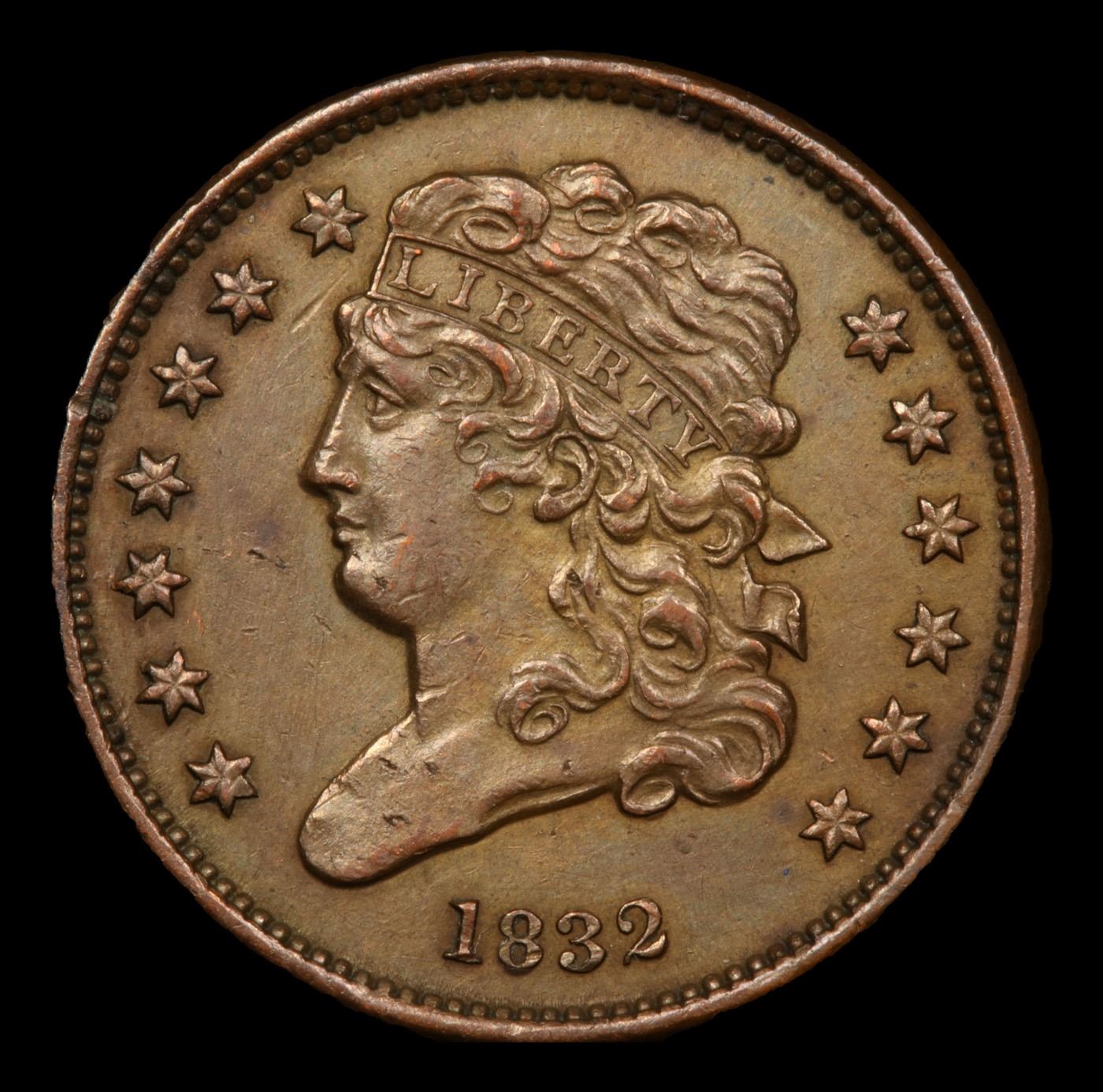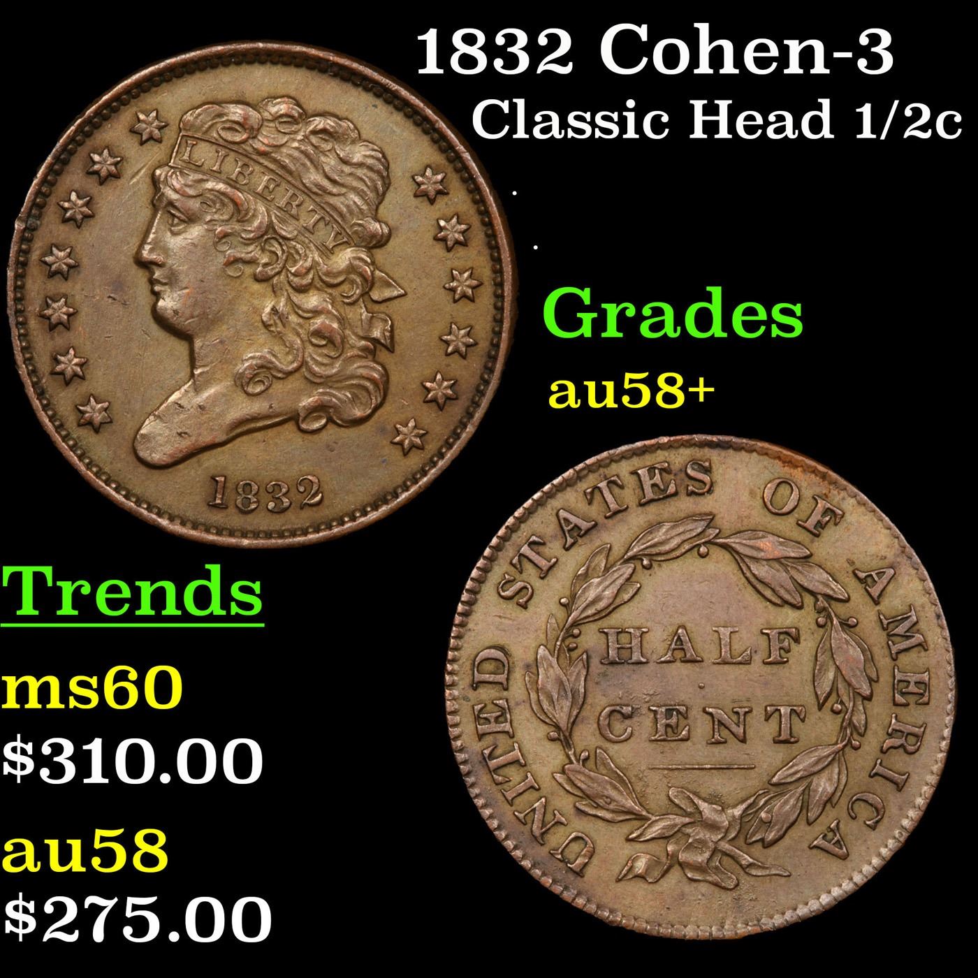 1832 Cohen-3 Classic Head half cent 1/2c Grades Choice AU/BU Slider+.