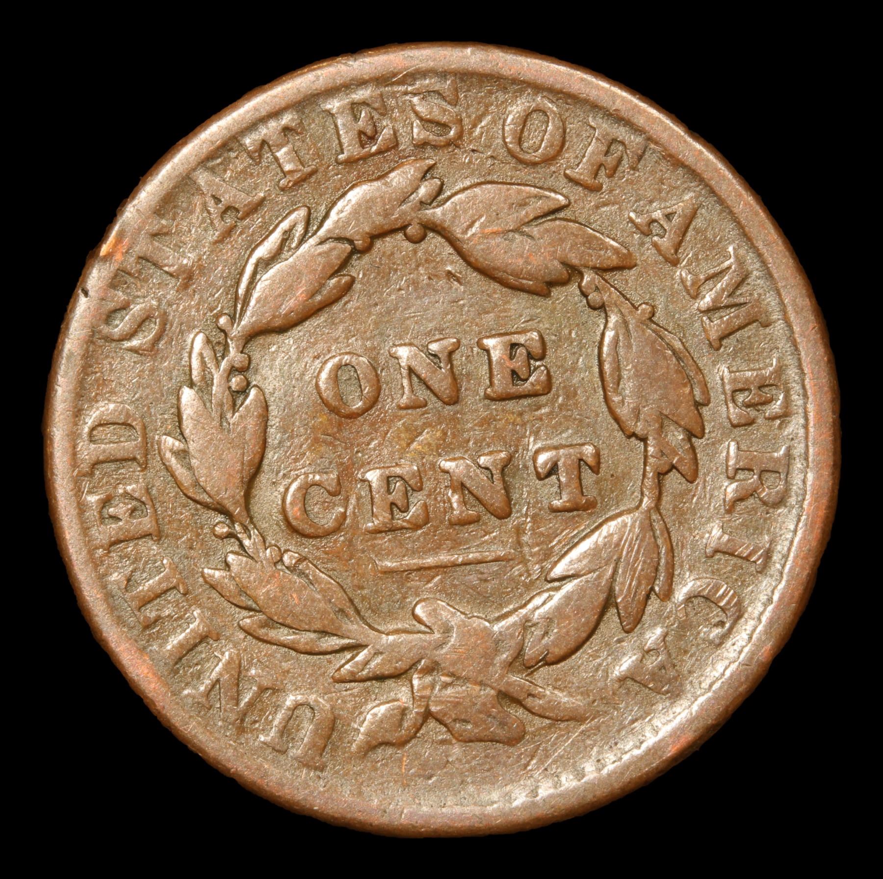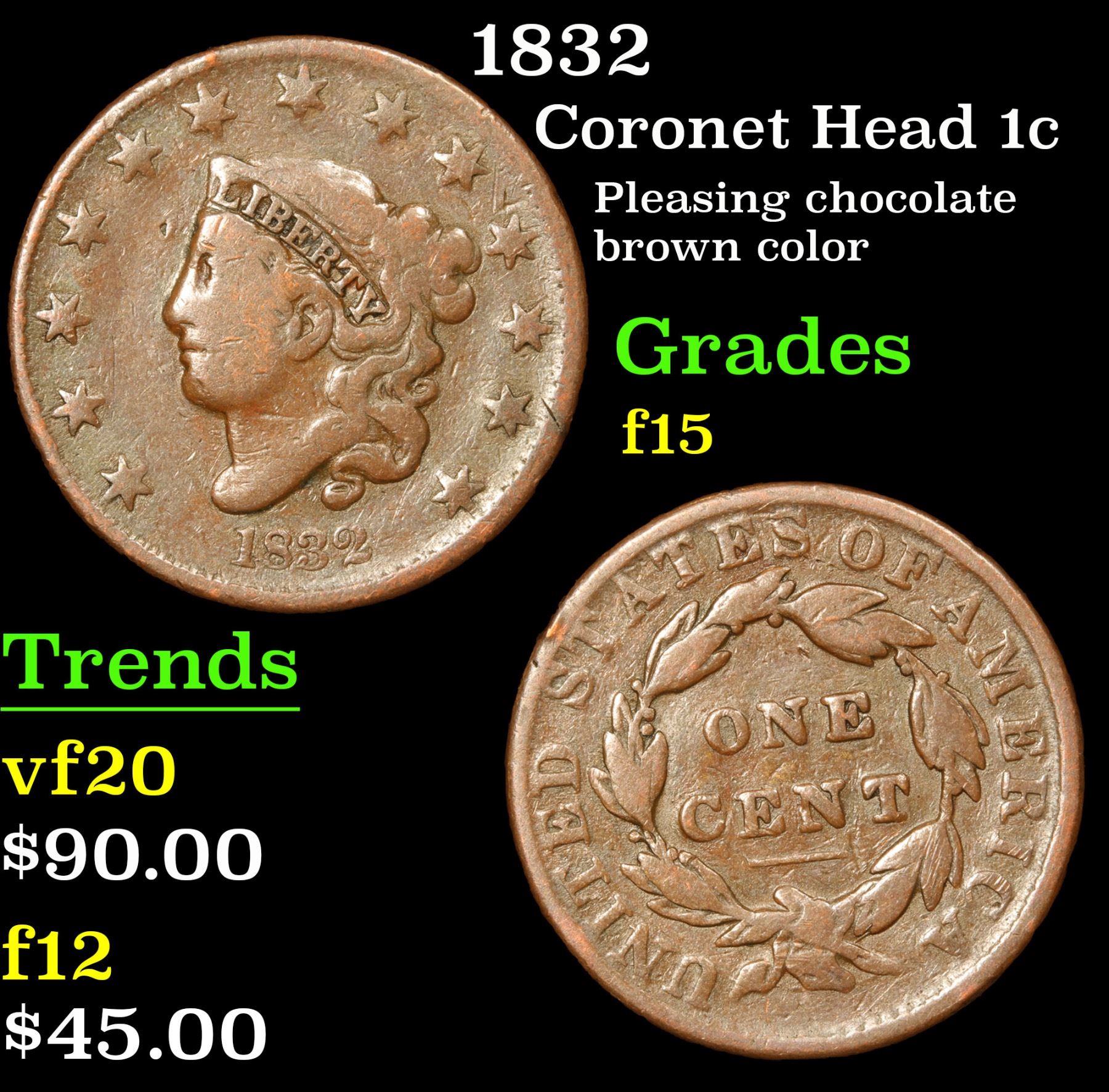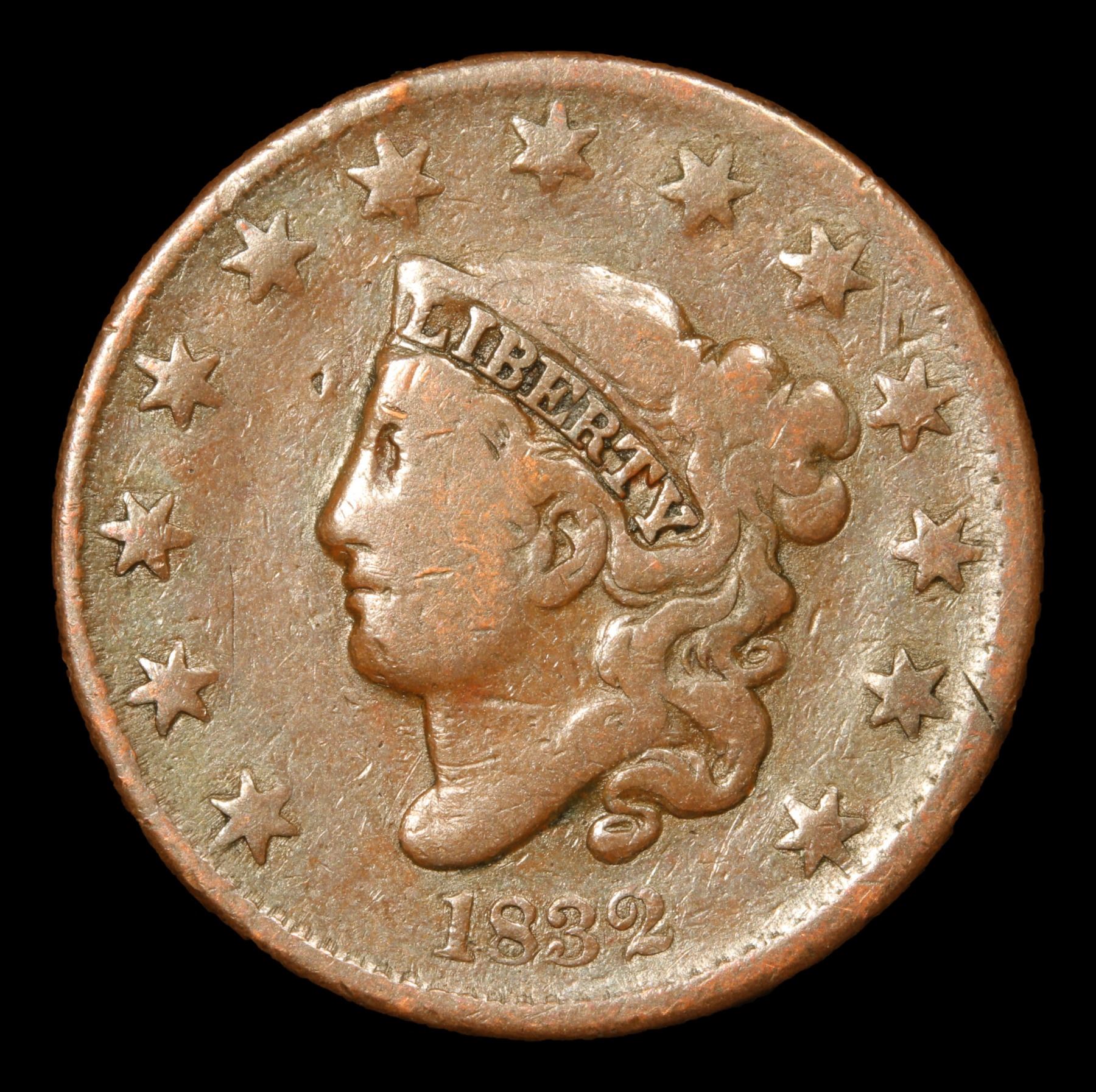 1832 Coronet Head Large Cent 1c Grades f+. Pleasing chocolate brown color