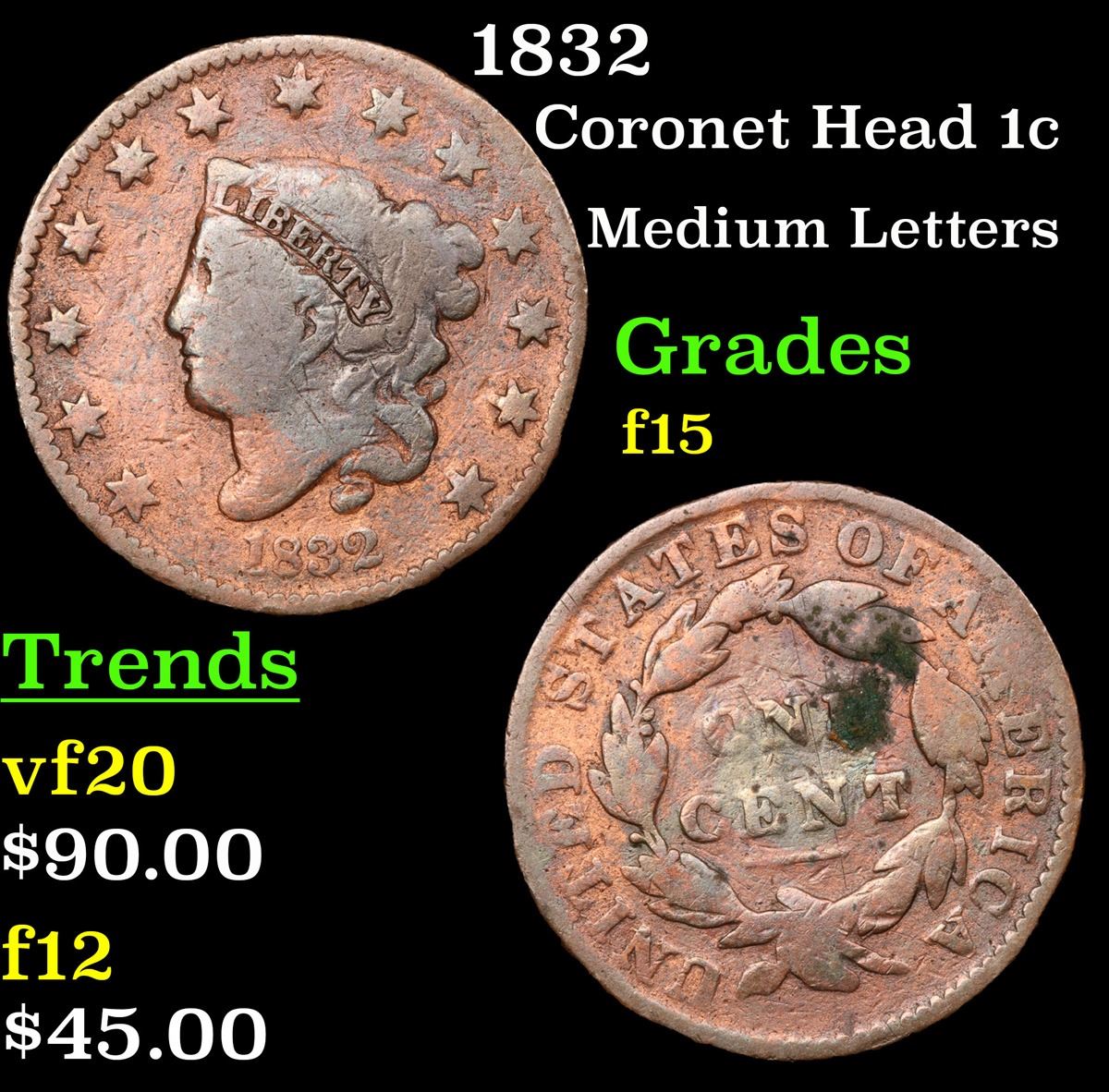 1832 Medium Letters . Coronet Head Large Cent 1c Grades f+.