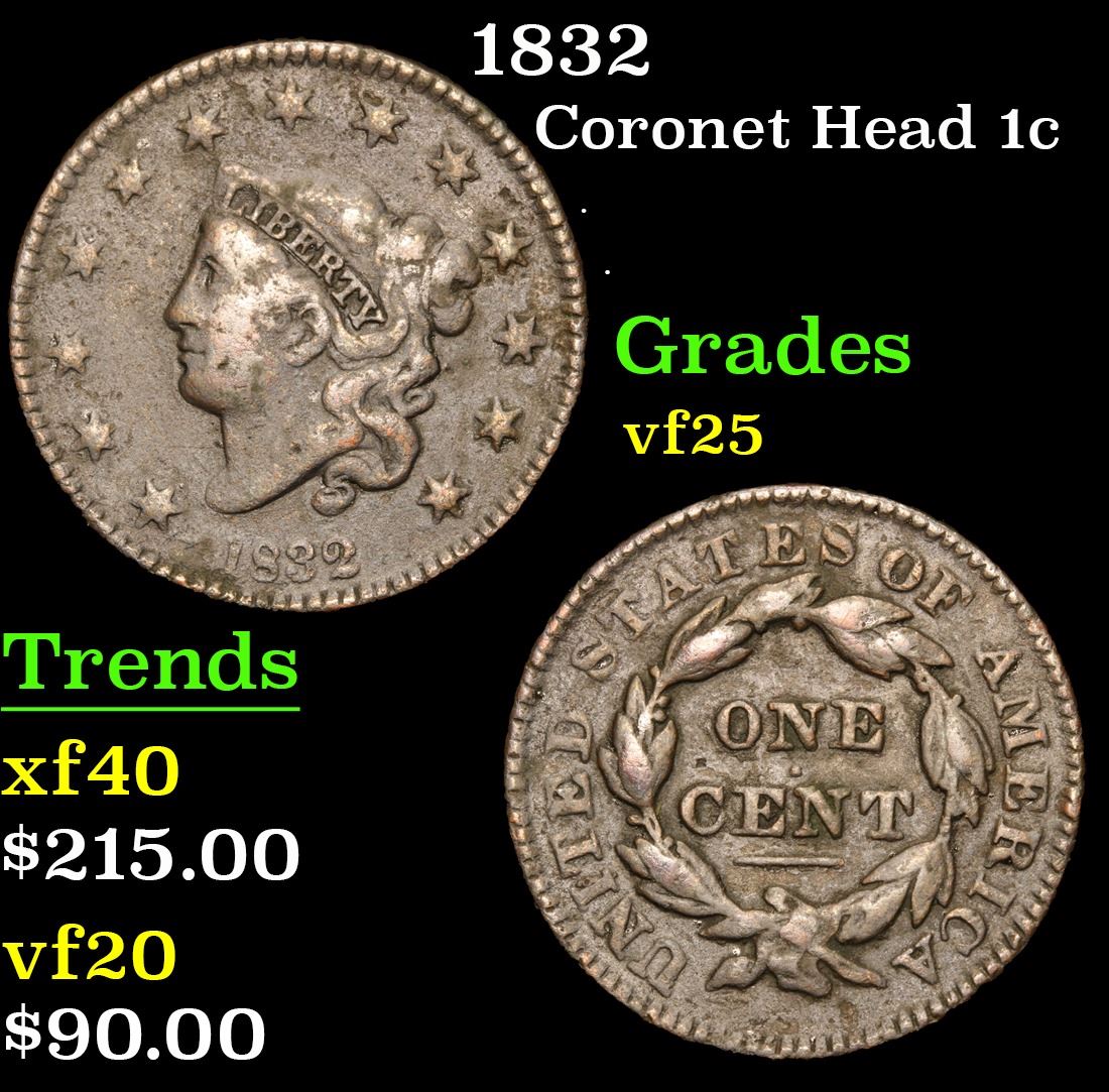 1832 Coronet Head Large Cent 1c Grades vf+.