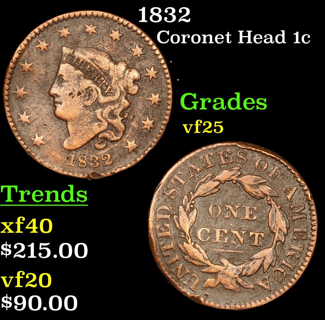 1832 . . Coronet Head Large Cent 1c Grades vf+.