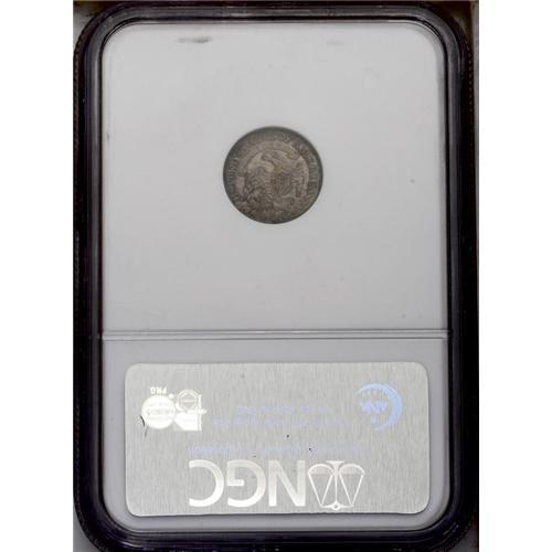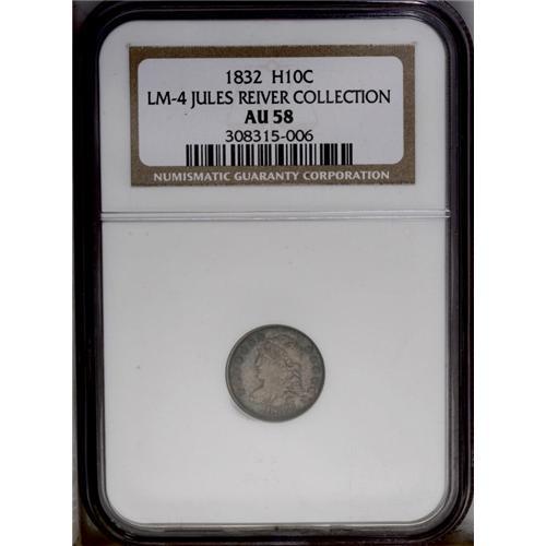 <B>1832<H10C> AU58 NGC.</B></I> V-12, LM-4, R.4. One of the few Bust Half Dime die marriages unknown to Valentine, LM-4 was first described by Walter Breen in 1958. The prominent die crack above the cap, combined with a filled upper loop on the second S in STATES, confirms this scarce variety. Medium gray patina bathes each side of this well defined half dime. A minute unobtrusive mark is noted in the field to the right of the 2 in the date. Envelope Included.