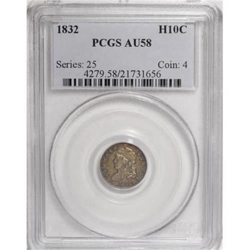 <B>1832 H10C AU58 PCGS.</B></I> PCGS Population (81/382). NGC Census: (104/549). Mintage: 965,000. Numismedia Wsl. Price for NGC/PCGS coin in AU58: $225. (#4279)<BR><BR><B>Coin Engraver:</B> William Kneass<BR><BR><b>Shipping:</b> Coins & Currency (<a target="_blank" href="http://www.heritageauctions.com/common/shipping.php">view shipping information</a>)