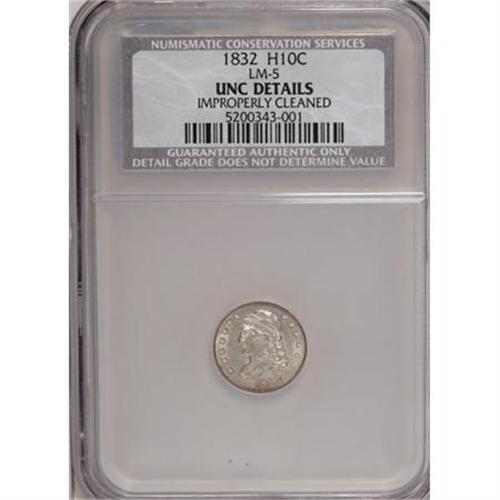<B>1832 H10C --Improperly Cleaned--NCS. UNC Details.</B></I> LM-5. NGC Census: (4/548). PCGS Population (13/375). Mintage: 965,000. Numismedia Wsl. Price for NGC/PCGS coin in MS60: $308. (#4279)<BR><BR><B>Coin Engraver:</B> William Kneass<BR><BR><b>Shipping:</b> Coins & Currency (<a target="_blank" href="http://www.heritageauctions.com/common/shipping.php">view shipping information</a>)
