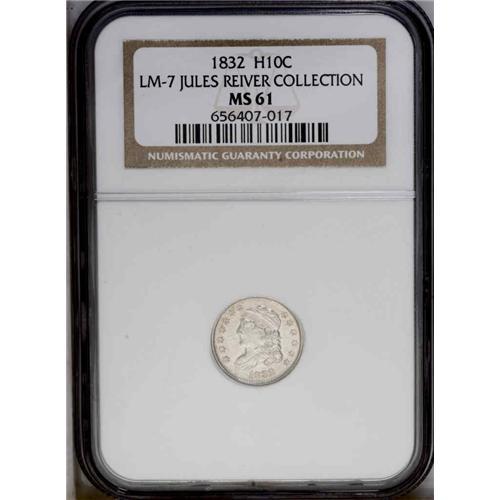 <B>1832<H10C> V-9, LM-7, R.2. Reiver state c. MS61 NGC.</B></I> Bright silver with a trace of gold starting to form on the reverse. Well struck and a middle die state with the obverse crack from the 1 in the date up through the first six stars light. The reverse has the first S in STATES filled at the top. Clean surfaces for the grade.<BR><I>Ex: Tyler Coin (February 1987).</B></I> Envelope Included.