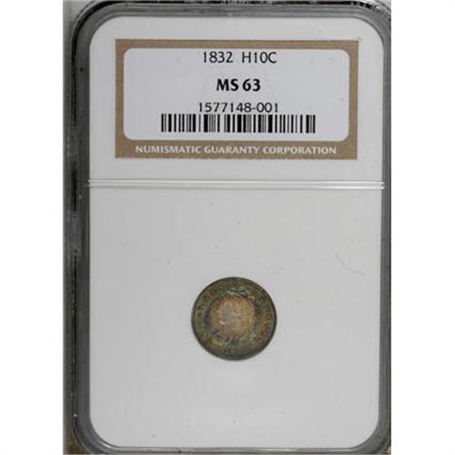 <B>1832 H10C MS63 NGC.</B></I> V-5, LM-8, R.3. Ocean-blue and plum-red with light golden-brown centers. Well struck and satiny with exemplary preservation aside from a small obverse mark at 9 o'clock.<BR><BR><B>Coin Engraver:</B> William Kneass<BR><BR><b>Shipping:</b> Coins & Currency (<a target="_blank" href="http://www.heritageauctions.com/common/shipping.php">view shipping information</a>)