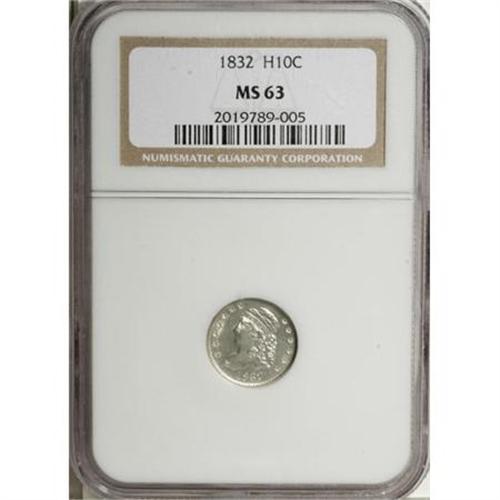 <B>1832 H10C MS63 NGC.</B></I> V-9, LM-7, R.2. The upright of the E in STATES is centered between BU in PLURIBUS. This brilliant and slightly prooflike example has a good strike and impressive surfaces.<BR><BR><B>Coin Engraver:</B> William Kneass<BR><BR><b>Shipping:</b> Coins & Currency (<a target="_blank" href="http://www.heritageauctions.com/common/shipping.php">view shipping information</a>)
