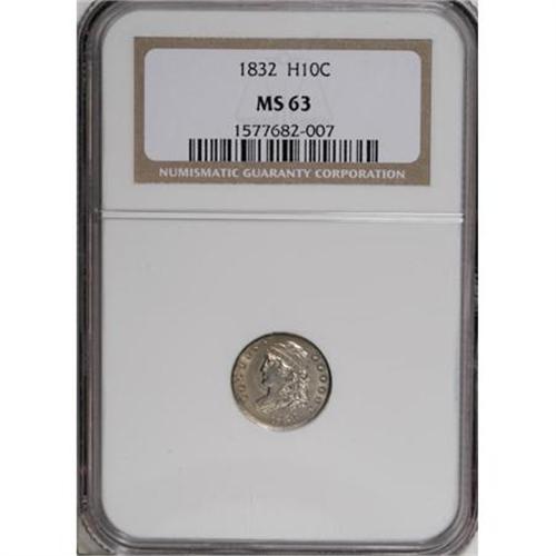 <B>1832 H10C MS63 NGC.</B></I> V-1, LM-3, R.1. A shining Select representative of this available die pairing, well-defined overall with excellent visual appeal. Delicate olive and sage accents grace the otherwise silver-gray surfaces.<BR><BR><B>Coin Engraver:</B> William Kneass<BR><BR><b>Shipping:</b> Coins & Currency (<a target="_blank" href="http://www.heritageauctions.com/common/shipping.php">view shipping information</a>)