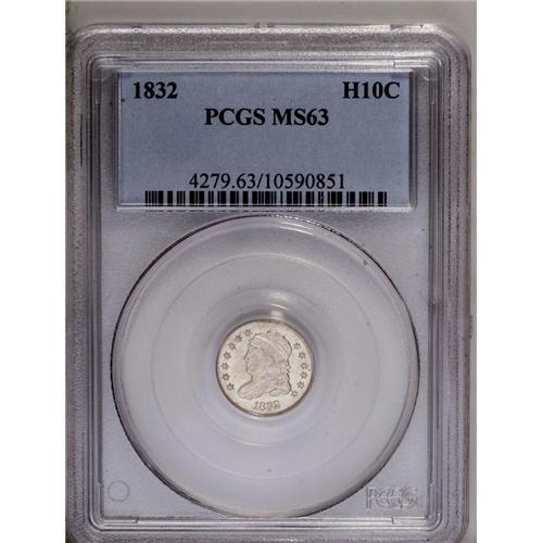 <B>1832<H10C> MS63 PCGS.</B></I> V-2, LM-12, R.2. Variety is confirmed by repunching on star 12, star 13 four times closer to the curl than to the dentils, and the low second E of STATES. Silver surfaces display soft luster and just a trace of light tan under magnification. Center weakness is noted on both sides, as are some inoffensive light handling marks.