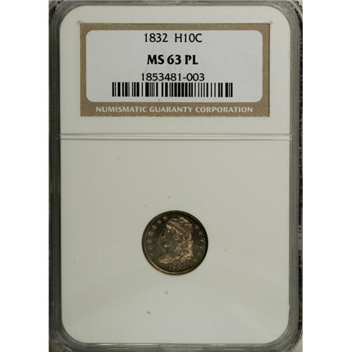 <B>1832 H10C MS63 Prooflike NGC.</B></I> V-1, LM-3, R.1. The present piece is the only 1832 half dime with a Prooflike designation from NGC, as of (12/06). It is a boldly struck example with light gold toning and unblemished fields.<BR><BR><b>Shipping:</b> Coins & Currency (<a target="_blank" href="http://www.heritageauctions.com/common/shipping.php">view shipping information</a>)