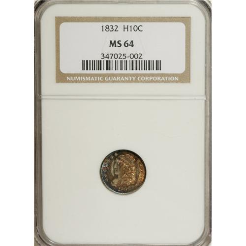 <B>1832 H10C MS64 NGC.</B></I> V-1, LM-3, R.1. Dramatic orange, ruby-red, and electric-blue toning illuminates the obverse of this sharply struck and shimmering near-Gem. The reverse is only lightly toned pearl-gray and plum.<BR><BR><b>Shipping:</b> Coins & Currency (<a target="_blank" href="http://www.heritageauctions.com/common/shipping.php">view shipping information</a>)
