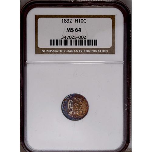 <B>1832<H10C> MS64 NGC.</B></I> V-1, LM-3, R.1. Orange, ruby-red, and electric-blue patination illuminate the obverse of this sharply struck and shimmering near-Gem. The reverse is only lightly toned in pearl-gray and plum tints.