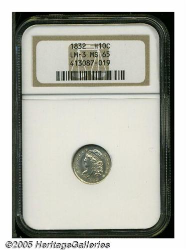 <B>1832<H10C> MS65 NGC.</B></I> V-1, LM-3, R.1. The second T in STATES is centered above the left upright of the second U in PLURIBUS. An untoned, silver-gray example that is generally quite sharp on the obverse and shows minor die clashing on the reverse. For accuracy, there is an area of striking weakness in the center of the reverse, on the top of the eagle's head. A remarkably well preserved Gem that seems entirely free of post-strike defects.