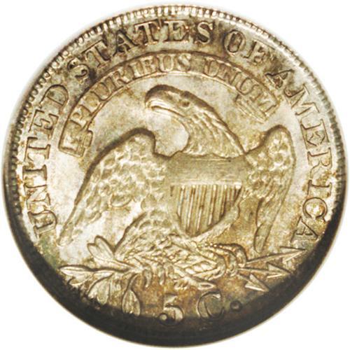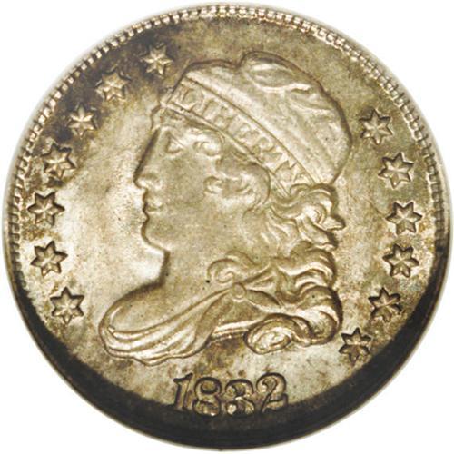 <B>1832<H10C> MS65 NGC.</B></I> V-2, LM-12, R.2. Original golden-brown, ivory-gray, and olive-green shades enrich this satiny Gem. The horizontal shield lines and the hair near the ear are soft, but all remaining design details are well struck. The absence of detectable marks confirms the exemplary quality.