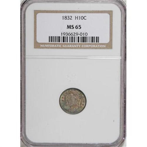 <B>1832 H10C MS65 NGC.</B></I> V-8, LM-5, R.1. This variety shows the upright of 1 in the date centered over a space between two dentils, and the R of AMERICA above I at the base. Golden-brown, apple-green, and plum grace this needle-sharp Gem type coin. Luster sweeps the surfaces, which are clean aside from minor contact in the field near the eagle's neck.<BR><BR><B>Coin Engraver:</B> William Kneass<BR><BR><b>Shipping:</b> Coins & Currency (<a target="_blank" href="http://www.heritageauctions.com/common/shipping.php">view shipping information</a>\)