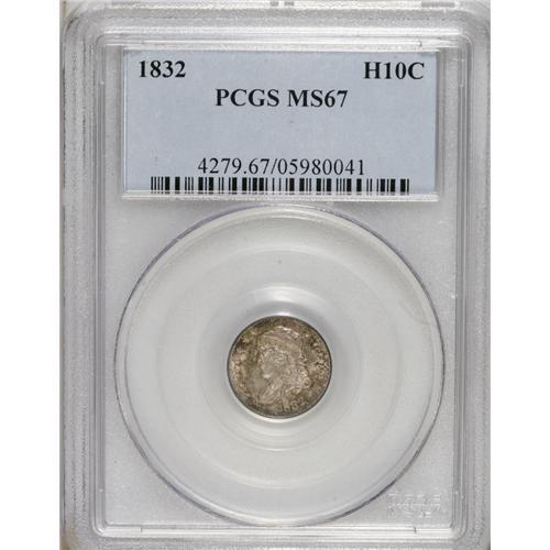 <B>1832 H10C MS67 PCGS.</B></I> V-1, LM-3, R.1. Star 12 is repunched and the last A in AMERICA touches the arrowhead on this variety. The 1832 is readily available through near-Gem, but is considerably more elusive in the MS67 level of preservation. Lustrous surfaces on the present piece are visited by a medley of mauve, gray, green, and red patination, and the design features are well impressed. Population: 7 in 67, 1 finer (2/07).<BR><BR><b>Shipping:</b> Coins & Currency (<a target="_blank" href="http://www.heritageauctions.com/common/shipping.php">view shipping information</a>)