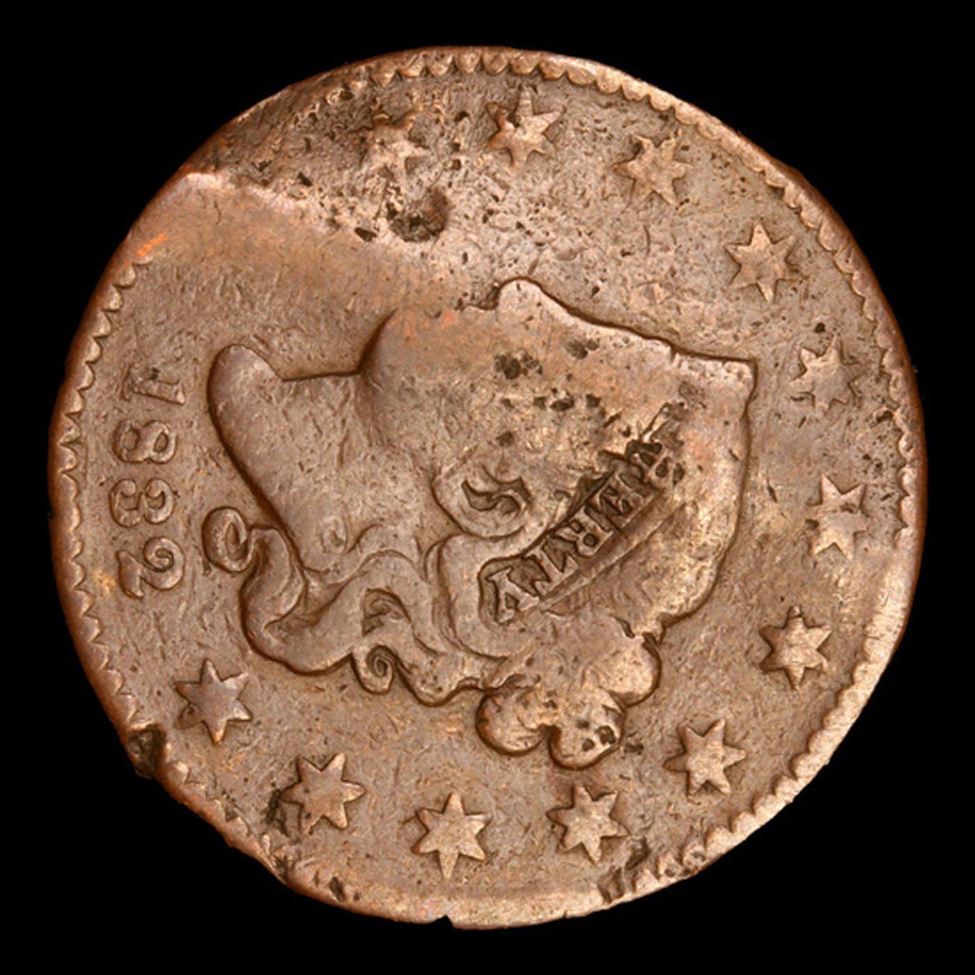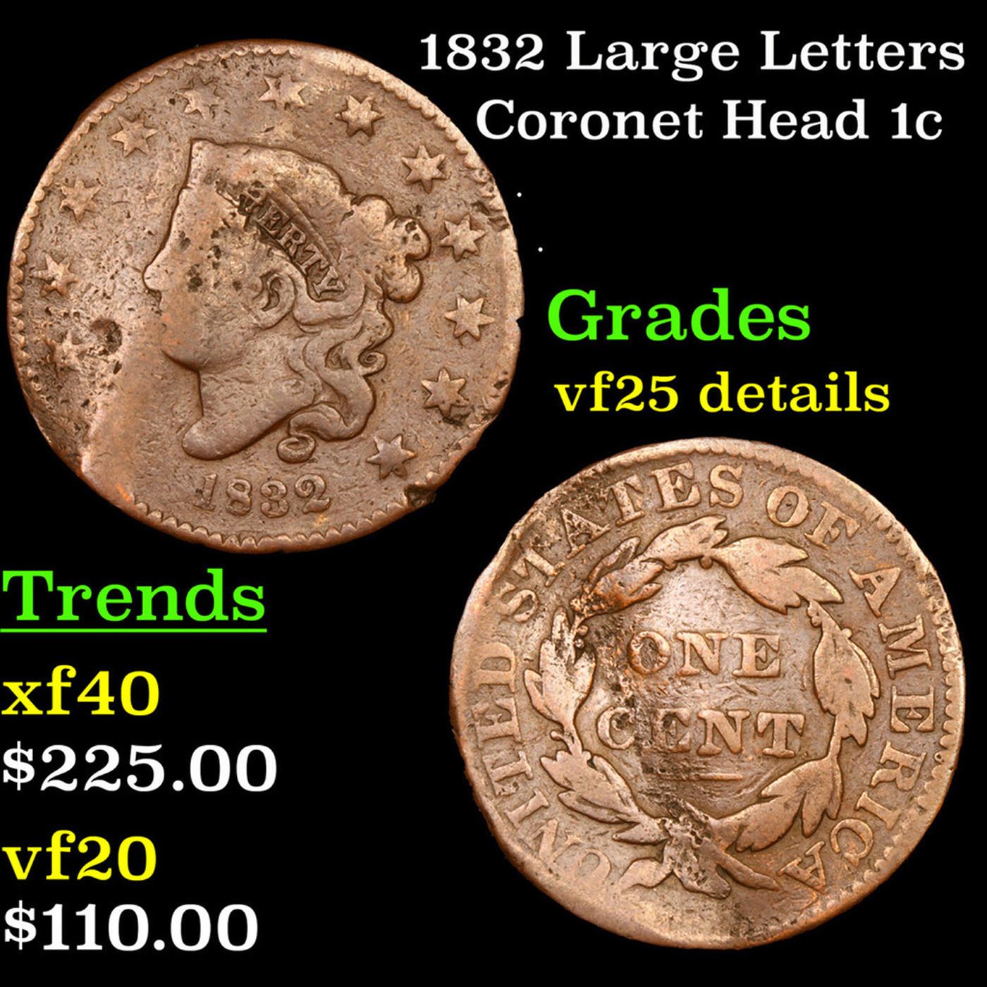 1832 Large Letters Coronet Head Large Cent 1c Grades VF Details.