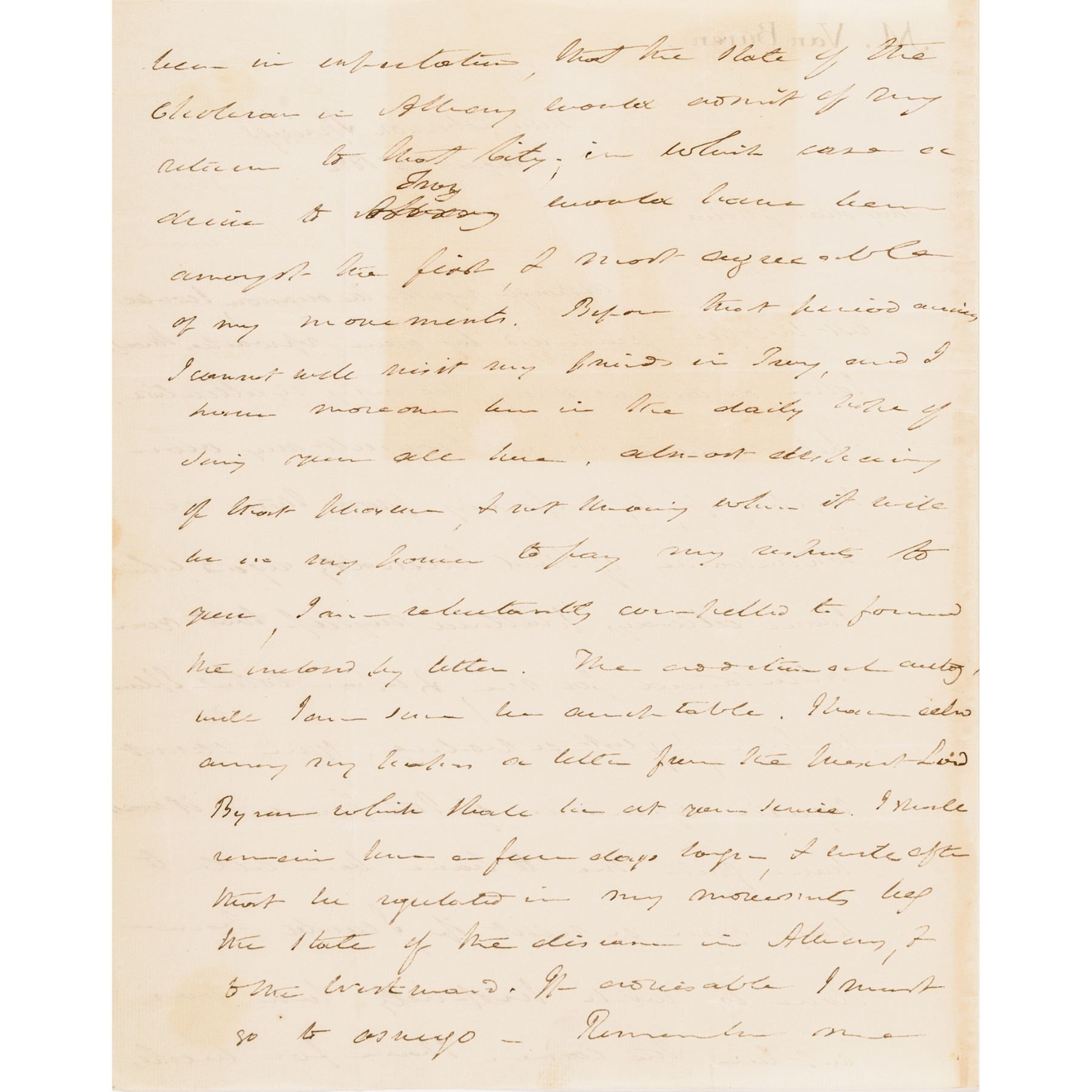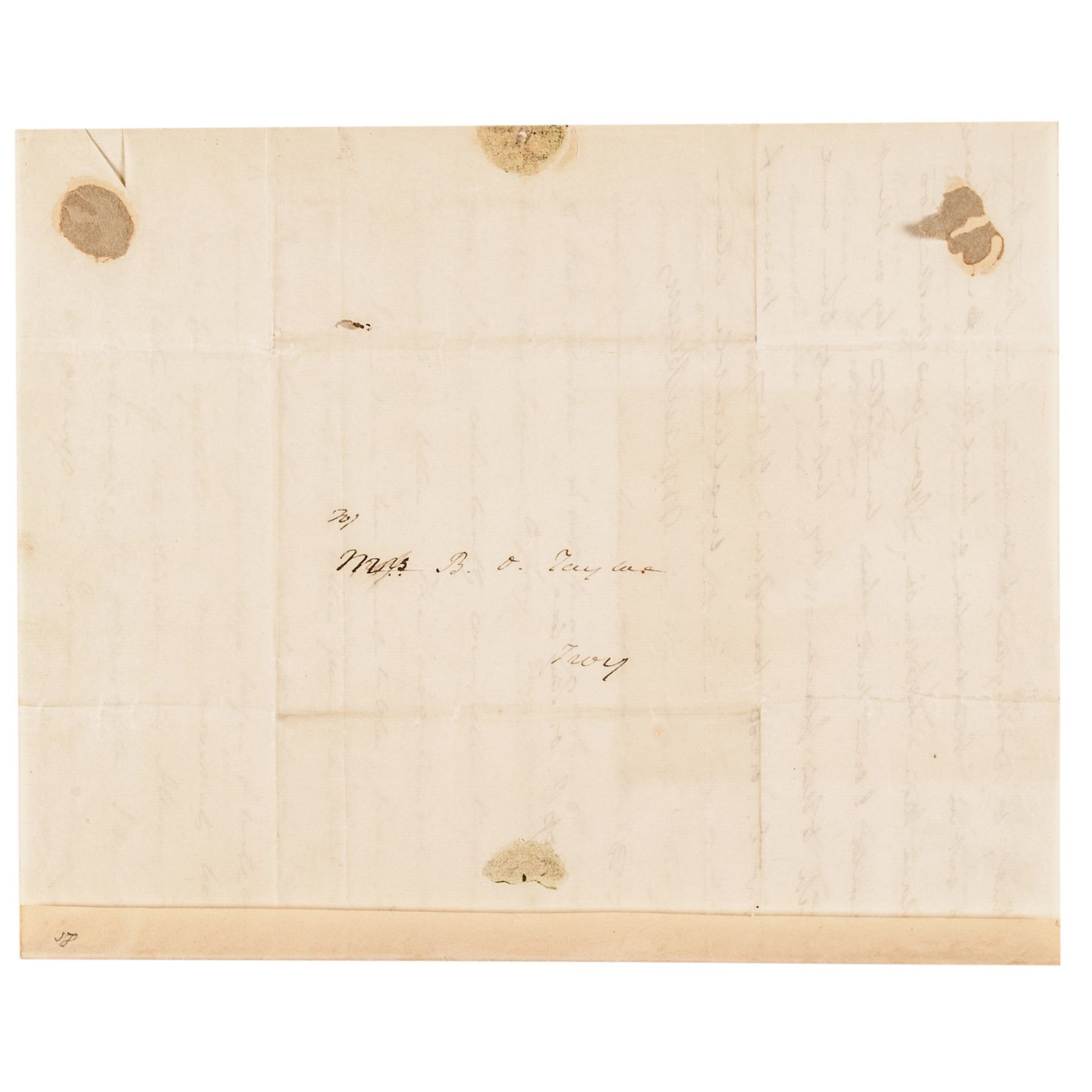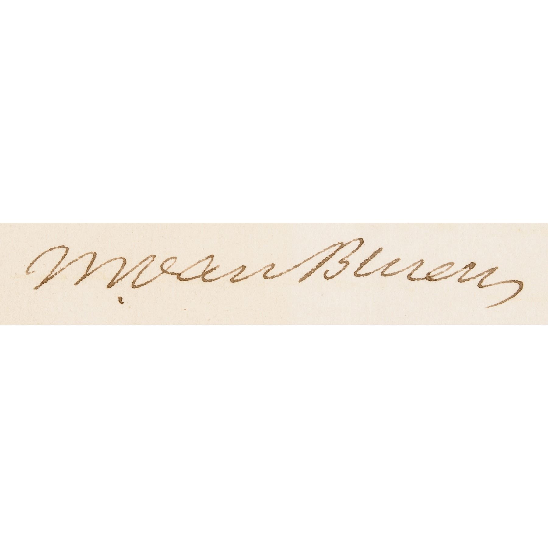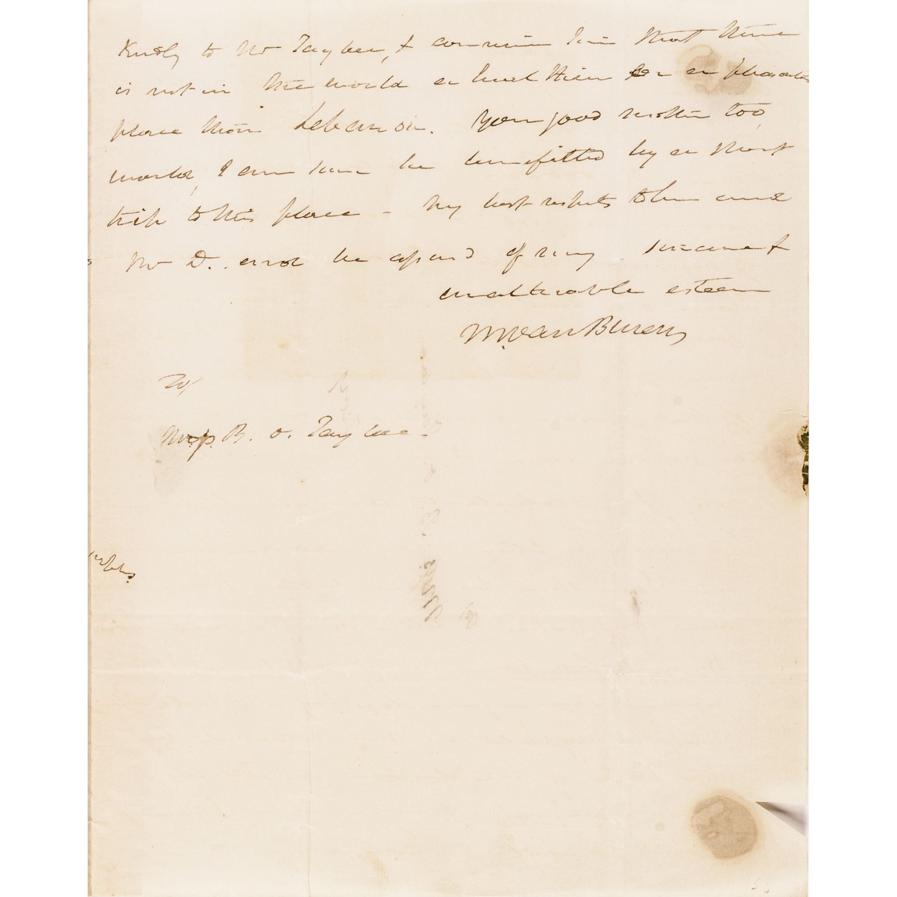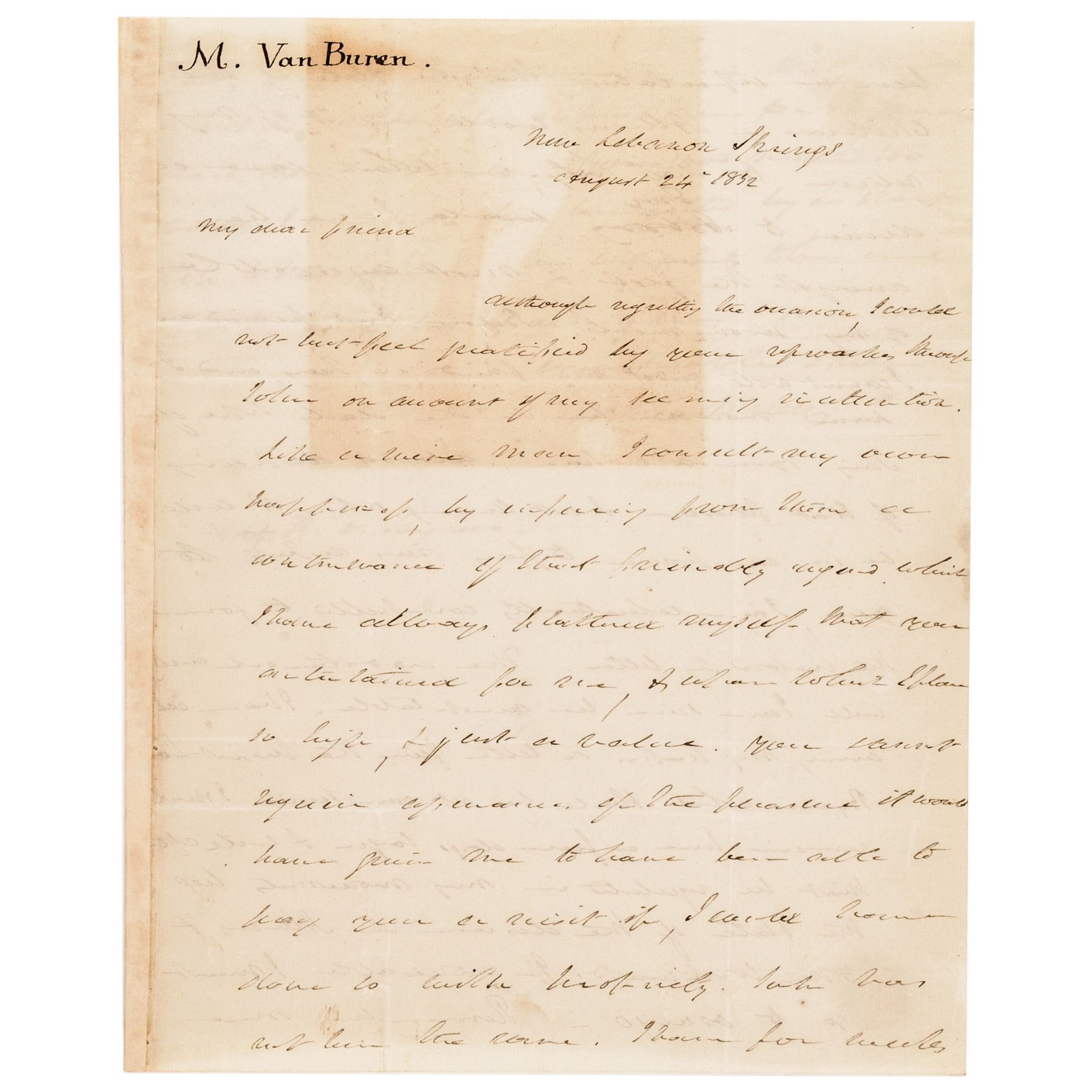 August 24, 1832-Dated, Autograph Letter Signed, “M. Van Buren” while U.S. Minister to the United Kingdom, measuring 7.75” x 9.75”, 3 pages with Integral Address Leaf written in his hand, New Lebanon Springs (New York), Fine. Archivally reinforced along left edge, some central tone to the upper portion, written on quality “R. AMES” watermarked laid paper with traces of red wax sealing and a small edge cut away from any text, when folded for mailing. Addressed to Mrs B.O. Taylor at Troy (NY), Van Buren writes to her as, “My dear friend” regarding his travels and his visit to Albany, yet apparently not to Troy. Typically written in his fine handwriting, and Signed on the conclusion of the third page at center “M. Van Buren” measuring a large 2.5” long.
