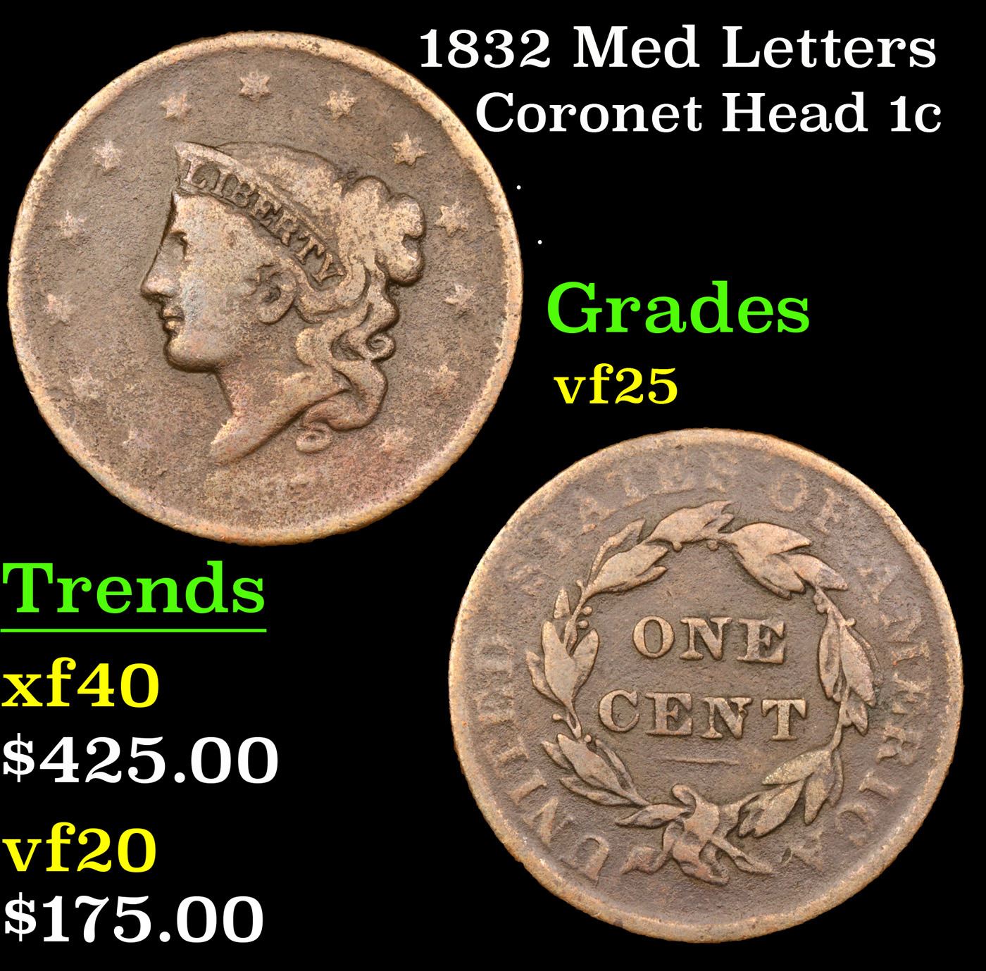 1832 Med Letters Coronet Head Large Cent 1c Grades vf+.