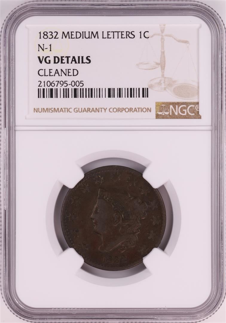 One 1832 Medium Letters N-1 Coronet Head Large Cent Coin NGC VG Details. NGC Certified.