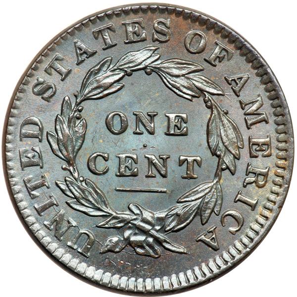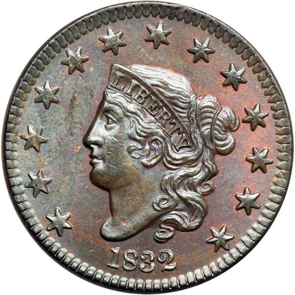 1832 N-1 R2 MS63. PCGS graded MS-64 Brown. Choice lustrous bluish steel brown with generous traces of faded mint color remaining on the obverse. Satiny and very attractive, virtually flawless. A dull, light rim nick over the right edge of star 7 is a good identifying mark. Nicely struck E-MDS, same as the preceding lot. The fields are covered with fine radial die flowlines but the die scratches from the leaf tip under the first A in AMERICA are clear. Called MS62 and tied for CC#7 in the Noyes census, his photo #36264. Our grade is MS63. Pop 2; 1 in 66. Only 4 graded at PCGS for the variety. DWH #3464.