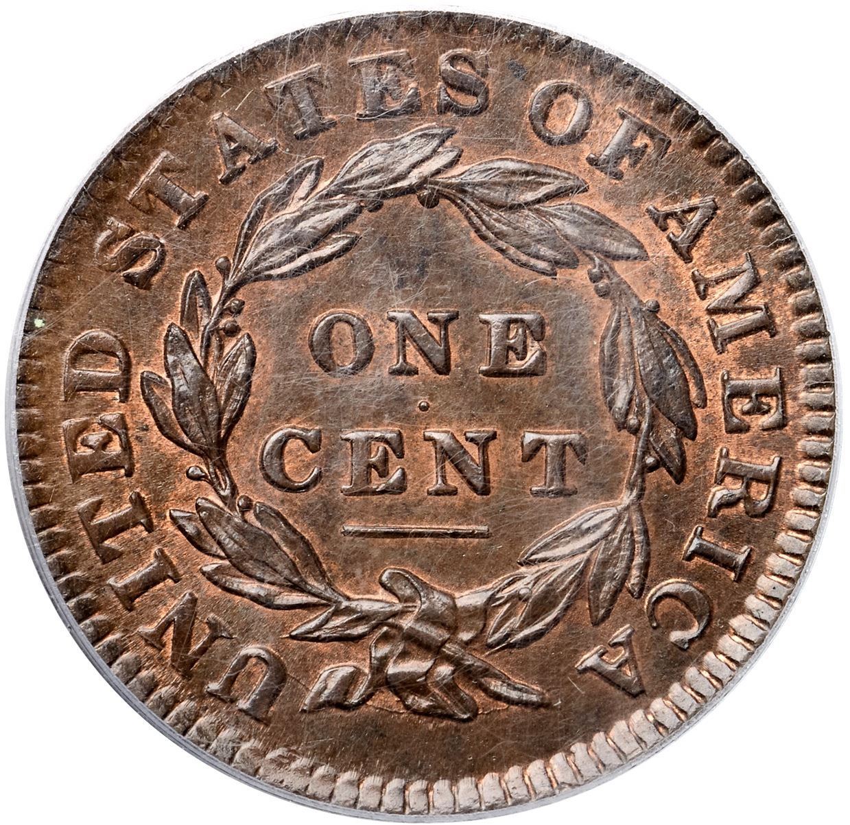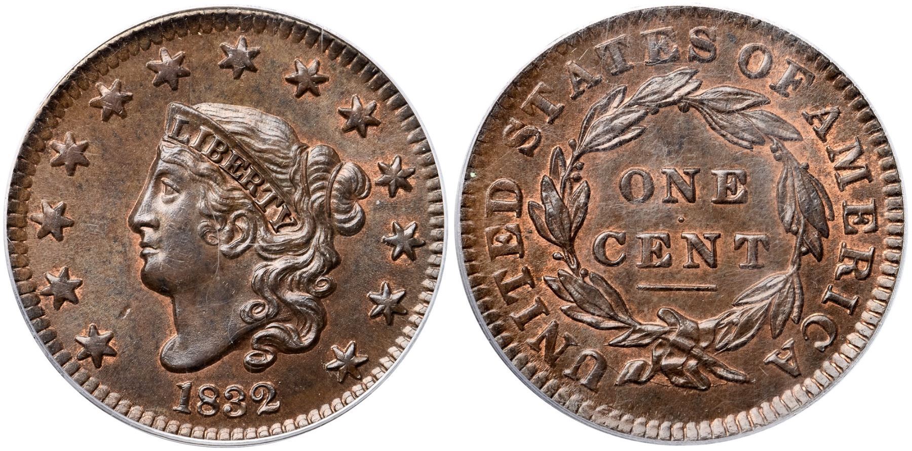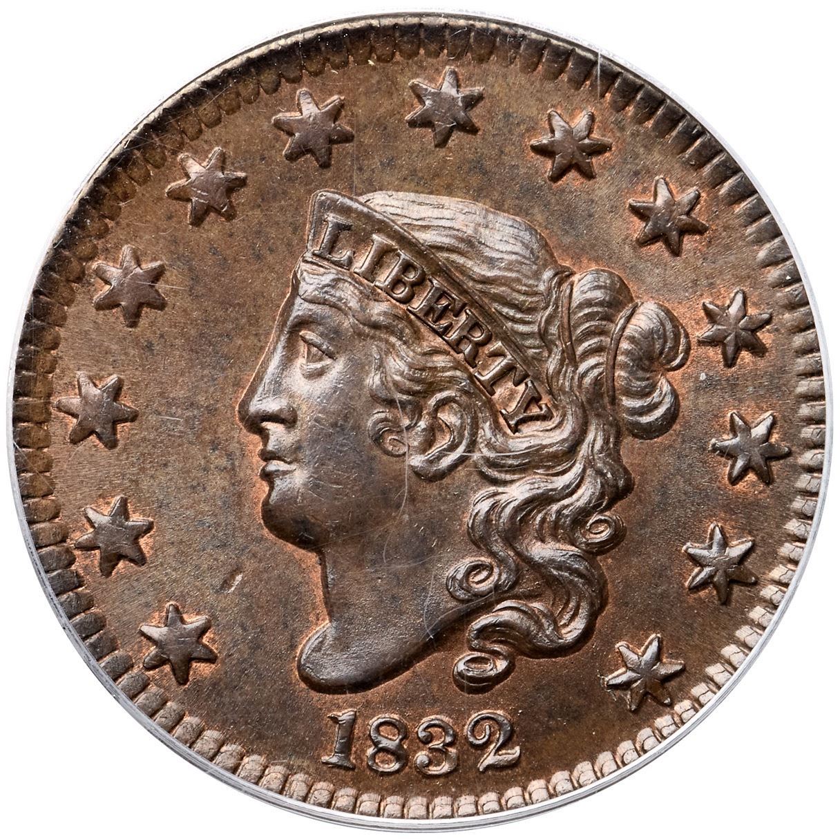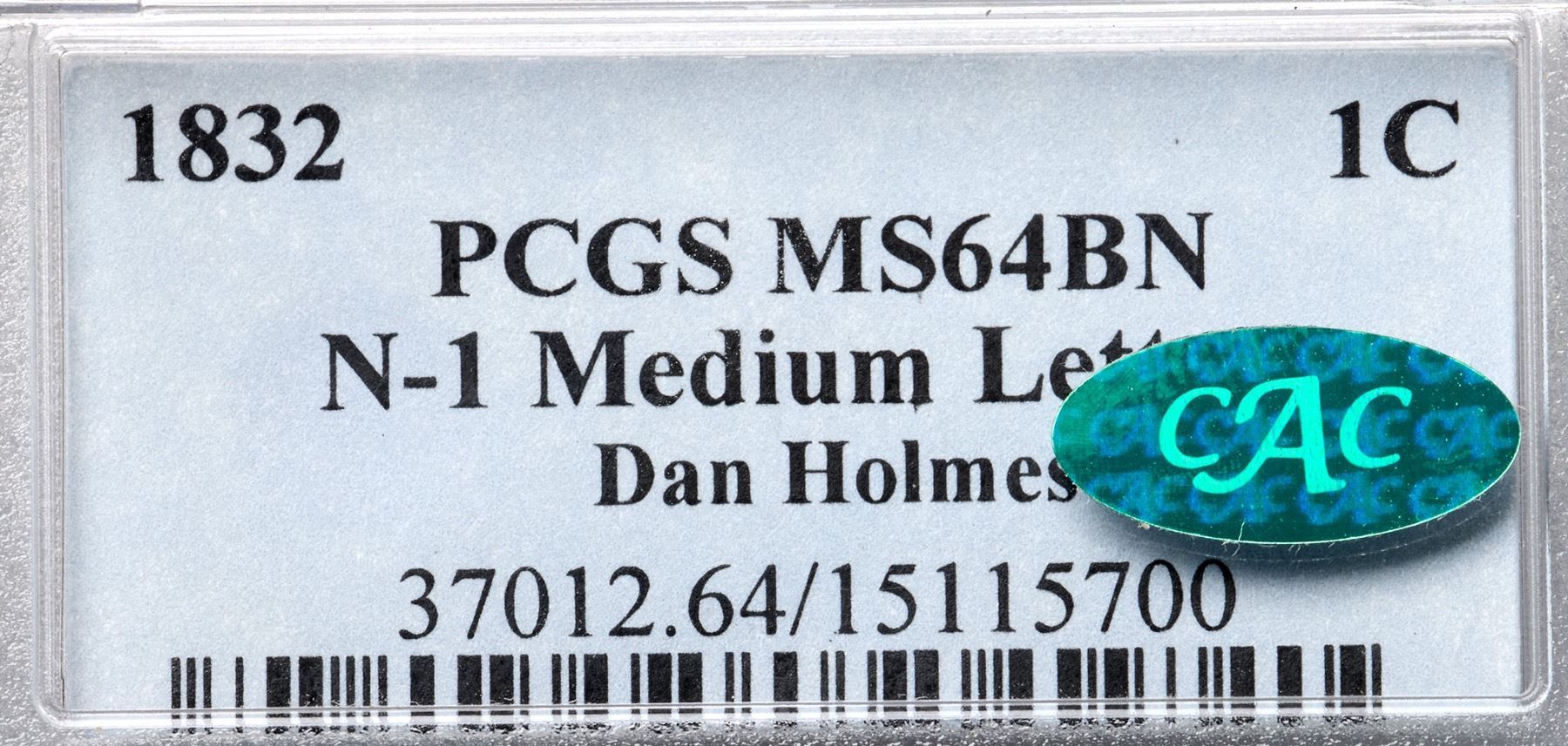 1832 N-1 R2 Medium Letters, PCGS graded MS64 Brown, CAC ApprovedChoice lustrous bluish steel brown and light chocolate with 5% of the mint color remaining on the obverse, 20% on the reverse. Virtually perfect except for a small, shallow planchet flake in the field midway between star 1 and the chin, as struck, and a small spot of very light carbon right of the second S in STATES. E-MDS, die state b early. Fine radial die flowlines cover the fields on both sides and a die crack reaches from the second A in AMERICA through the stem tip and ribbon to the base of UNITED (as always). The two die scratches from the leaf point under the first A in AMERICA are clear. A beautiful cent with outstanding eye appeal. Called MS63 “Choice” and tied for CC#1 in the Noyes census, his photo #35669. Our grade is MS63.Certificate Number: 37012.64/15115700Pedigree: Ex Julian Leidman 10/1994-Manuel Ahumada, 2006 EAC Sale, McCawley & Grellman Auctions 5/6/2006:343-Daniel W. Holmes, Jr., McCawley & Grellman Auctions 5/30/2010:369-Terry S. Denman Collection