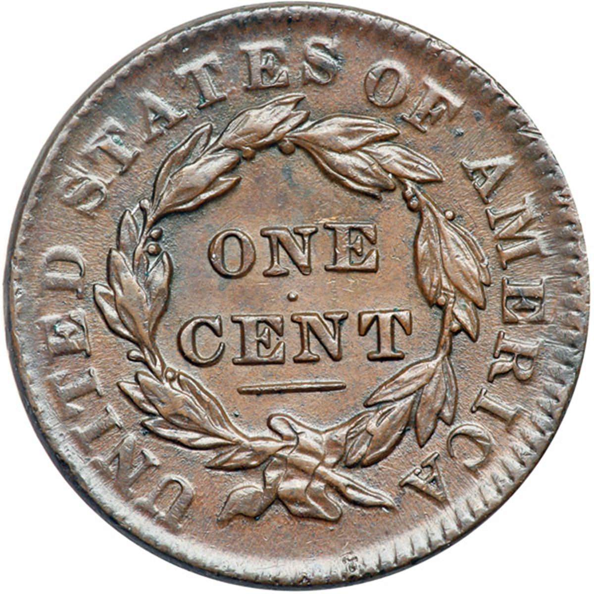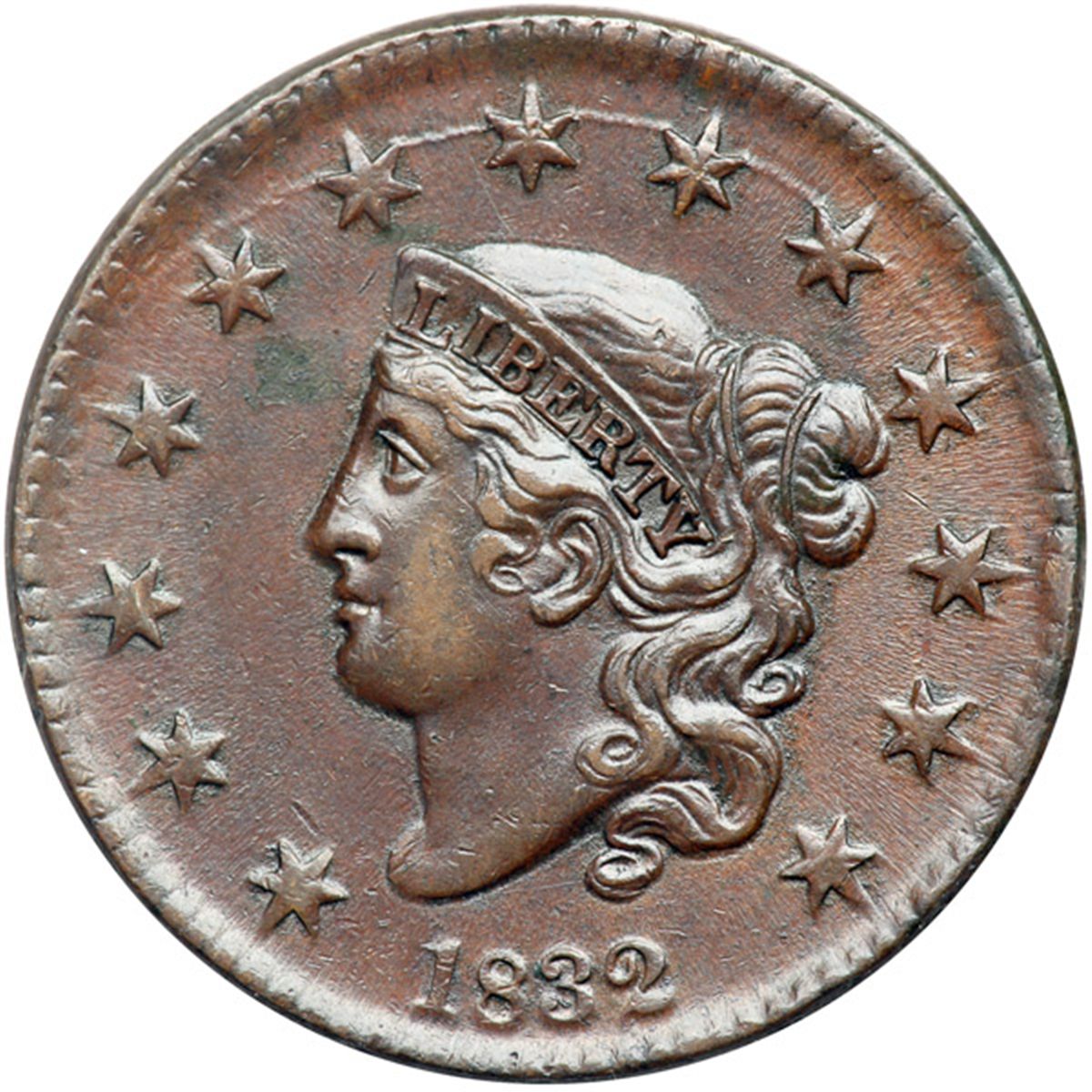 1832 N-2 R3 EF40+. Medium Letters with Large "ONE CENT." Nice glossy chocolate brown. Satiny mint luster covers the protected areas on both sides. The only marks are a small splash of slightly darker olive brown toning in the field off the browlock and a barely visible rim bruise at star 11. An attractive cent, close to EF45. MDS.