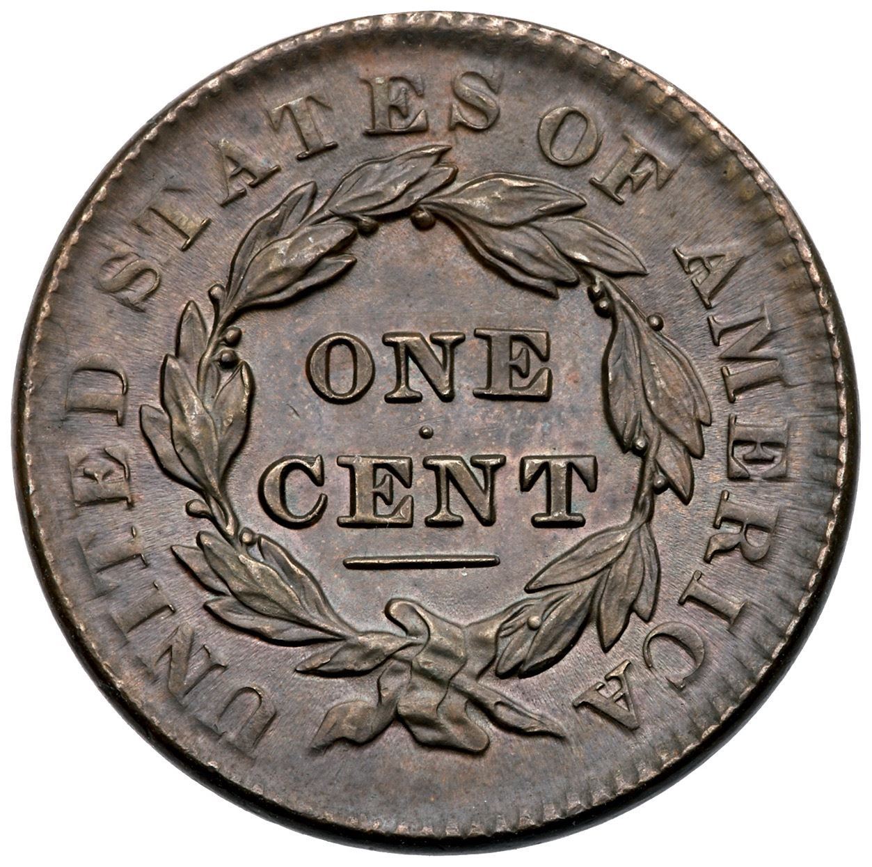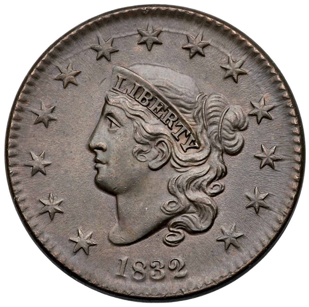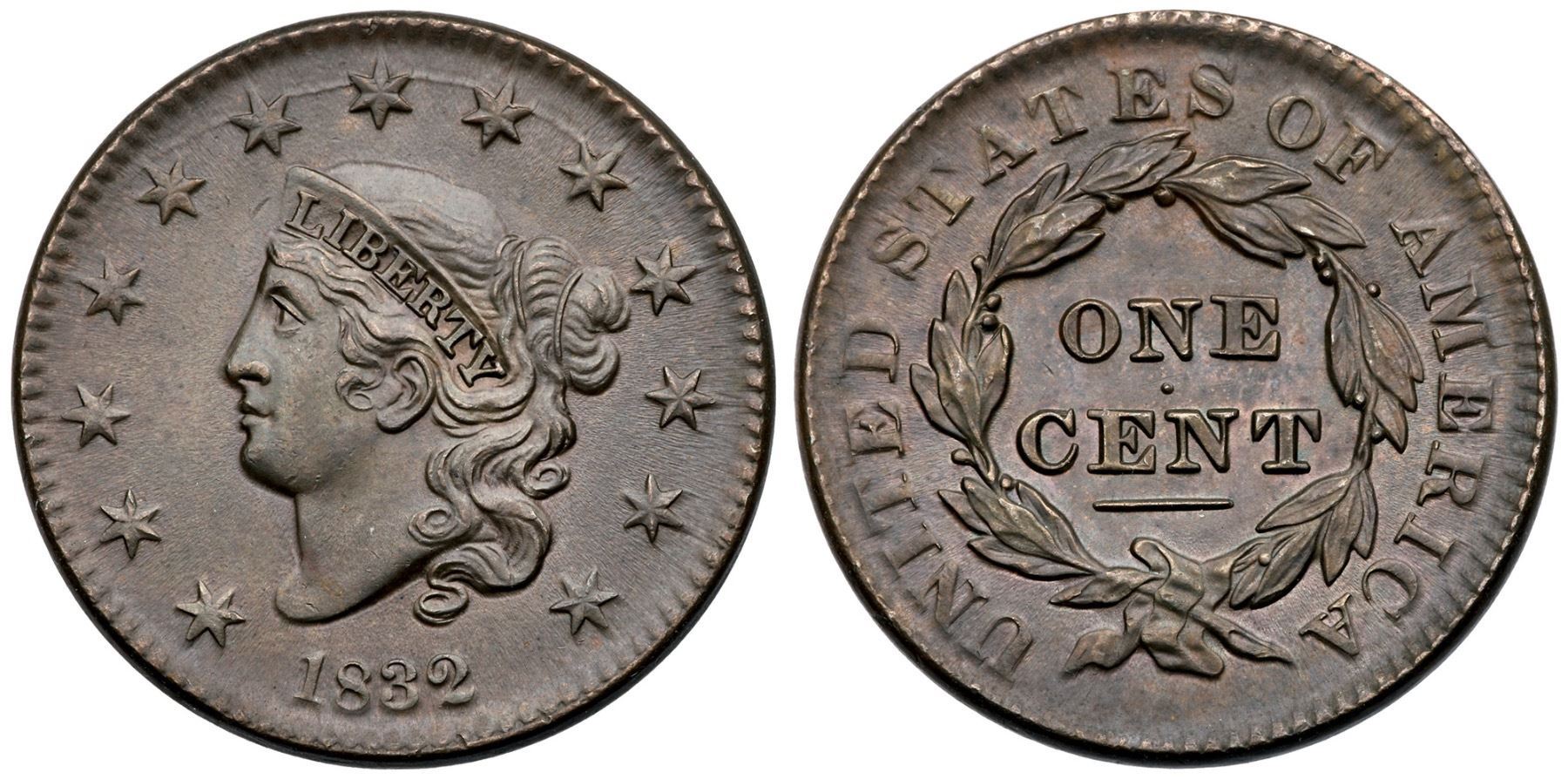 1832 N-2 R3- Small and Large Letters MS60+Beautiful lustrous steel and light olive brown with unbroken satiny mint frost covering this cent. Flawless except for a single small nick in the field before the front edge of the coronet. LDS, die state b, with flowlined fields on both sides. The misplaced S right of the D in UNITED is no longer visible. A wonderful cent, close to MS63.Certificate Number: Pedigree: Ex Chris McCawley 5/5/2000-Terry S. Denman Collection