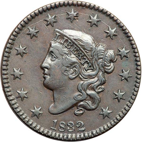 1832 N-2 R3- VF35. VF-35. Glossy dark steel brown and chocolate. Smooth surfaces with only a few trivial contact marks, including a thin nick high on the neck at the jawline and another under the tip of the wreath stem. Nicely struck EDS, a very scarce die state for this variety. The die crack at the upper stars is light, the dentils are crisp, and the fields are smooth. Clear evidence of the grossly misplaced S shows in the field left of the first S in STATES. Removed from an NGC slab graded AU50 (NGC label included, and it shows the attribution and Reiver provenance). DWH #2932.